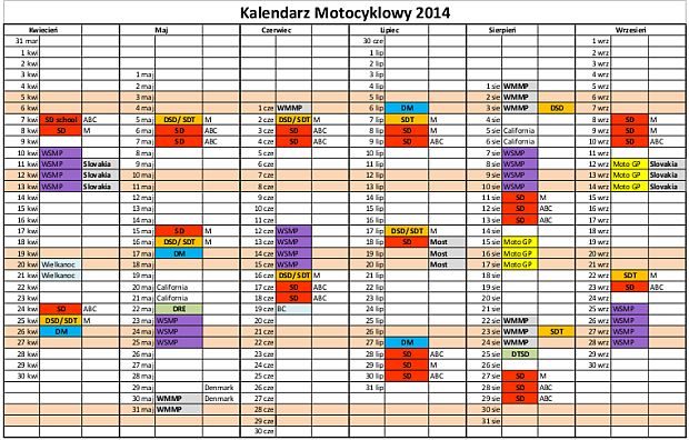 Pozostałymi kolorami oznaczone są inne ciekawe imprezy na Torze Poznań np. DRE i DTSD to dni w których odbywają się specjalne imprezy dla posiadaczy motocykli Ducati i Triumph. W kalendarzu zaznaczamy także: Szkolenie California Suprebike School, Wyścigowe Motocyklowe Mistrzostwa Polski, Wyścigowe Samochodowe Mistrzostwa Polski oraz inne imprezy.
