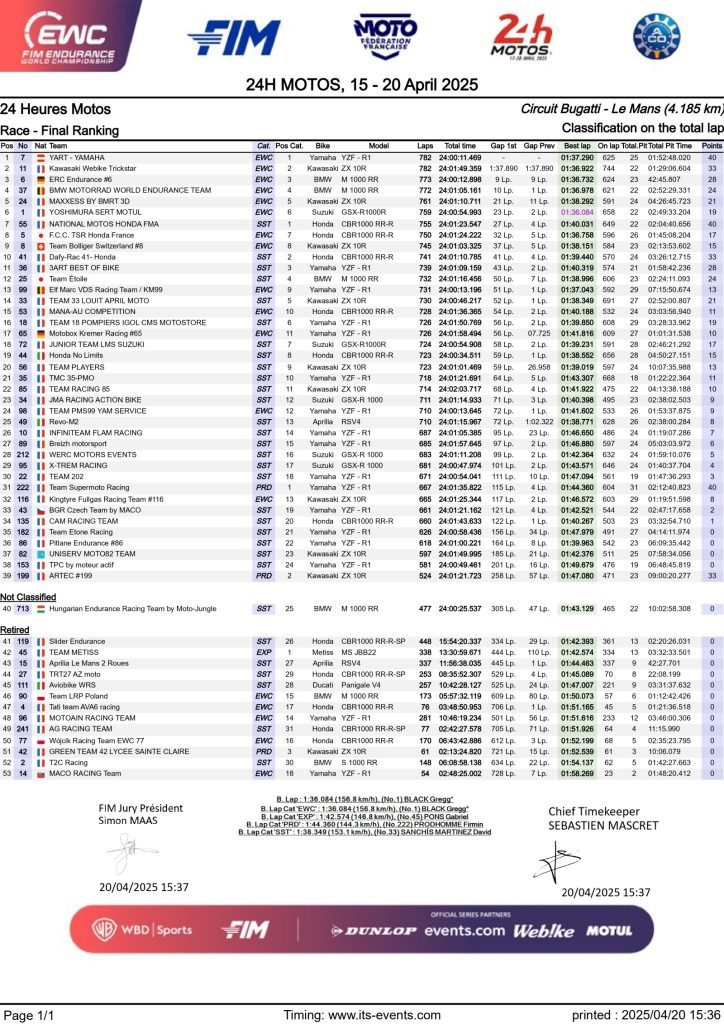 Ostatecznie to YART Yamaha (w składzie: Marvin Fritz, Karel Hanika i Jason O’Halloran) rozpoczęła sezon 2025 od wygranej i objęcia prowadzenia w klasyfikacji generalnej. Drugie miejsce zgarnął skład Kawasaki Webike Trickstar (Roman Ramos, Mike di Meglio, Gregory Leblanc), a podium uzupełnił zespół ERC Endurance #6 (Illya Mykhalchyk, Kenny Foray, David Checa). W Superstockach najlepszy był team National Motos Honda FMA, a w nowej kategorii FIM Endurance World Trophy (dla motocykli produkcyjnych) górą był Team Super Moto Racing.