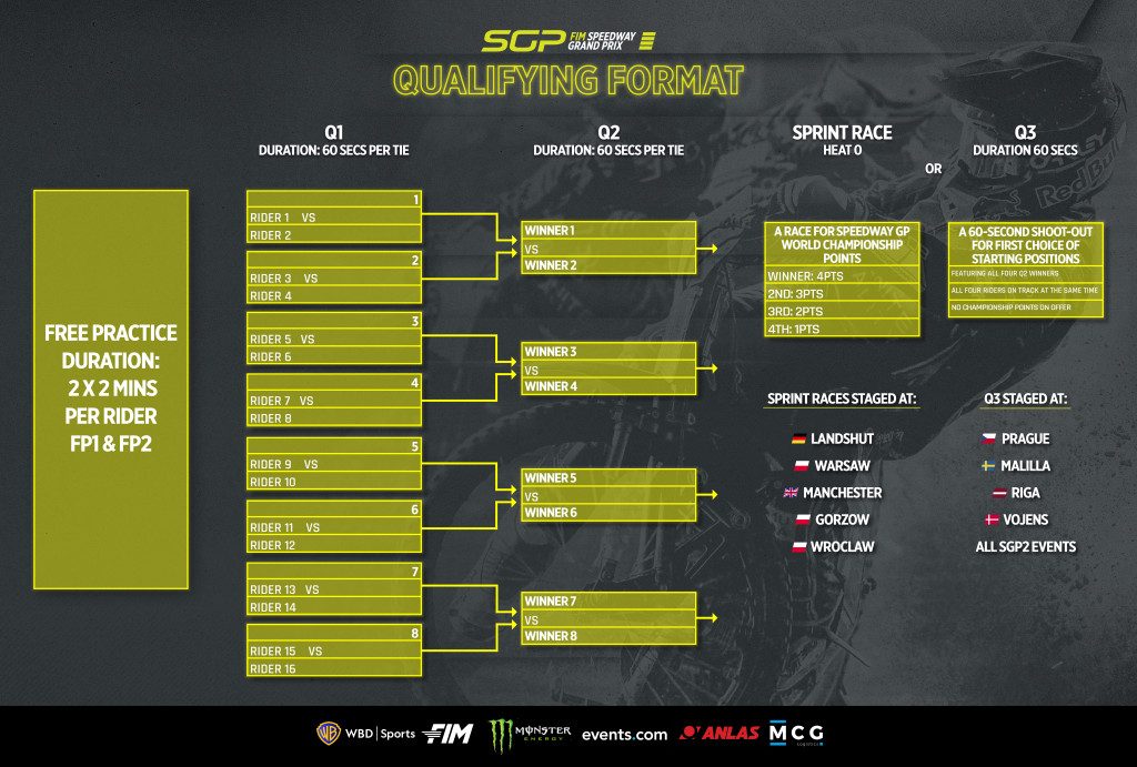 Nowe kwalifikacje SGP będą swoistymi zawodami pucharowymi, niczym tenisowy turniej wielkoszlemowy. Do kwalifikacji zawodnicy nie będą rozstawieni, tylko zostaną dobrani w pary w losowaniu FIM w Q1. Każda para gwiazd SGP może zostać dopasowana do siebie w Q1. Losowanie określa również, z kim zmierzy się każdy uczestnik, jeśli odniesie sukces w Q1.