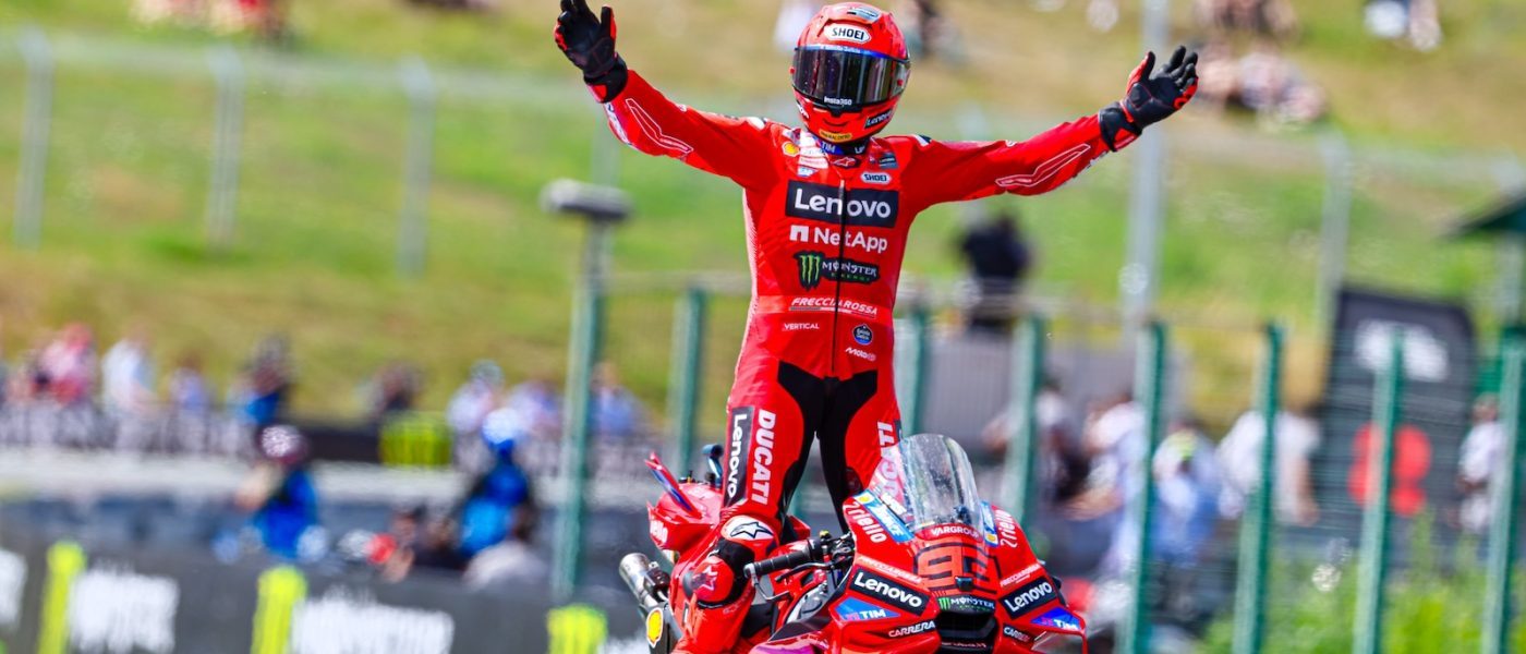 Na finiszu Marc Marquez był (znowu) pierwszy, zgarniając ósmy w tym roku dublet i zarazem piąty z rzędu! Mało tego, ośmiokrotny mistrz świata to pierwszy zawodnik Ducati, który wygrał pięć wyścigów z rzędu. Marco Bezzecchi po raz kolejny finiszował na podium, co jest tym ważniejsze, że przecież tydzień temu jadąc po „pudło” – przewrócił się. Podium uzupełnił z kolei Pedro Acosta, notując najlepszy weekend od dawna i potwierdzając, że KTM w Brnie zawsze jest mocny. Dla Hiszpana to pierwsze podium w wyścigu głównym w tym roku.