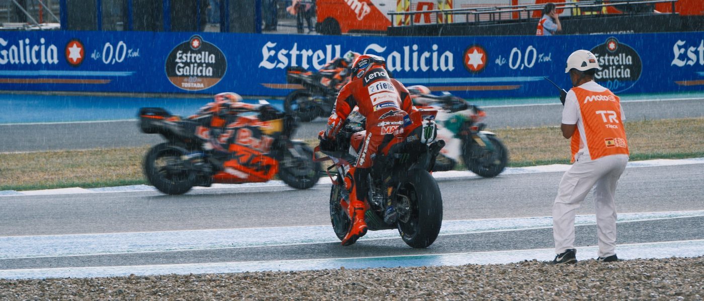 I gdy wydawało się, że to między braćmi rozegra się walka o triumf, do rywalizacji włączyła się pogoda. Chociaż kropiło już od drugiego okrążenia, a zawodnicy otrzymali wtedy zgodę na zamianę motocykli, rozpadało się dopiero w połowie rywalizacji. I to właśnie na pięć kółek przed metą, gdy mocno się rozpadało, to w ostatnim zakręcie toru Marc złapał uślizg przodu i przewrócił się! Hiszpanowi udało się podnieść motocykl, poczekał aż część rywali przejedzie przez zakręt… przeciął tor, zjechał do alei serwisowej i przeskoczył na Desmosedici z oponami deszczowymi. Problem w tym, że nie wjechał do pit-lane wyznaczonym wjazdem, a przeciął go…