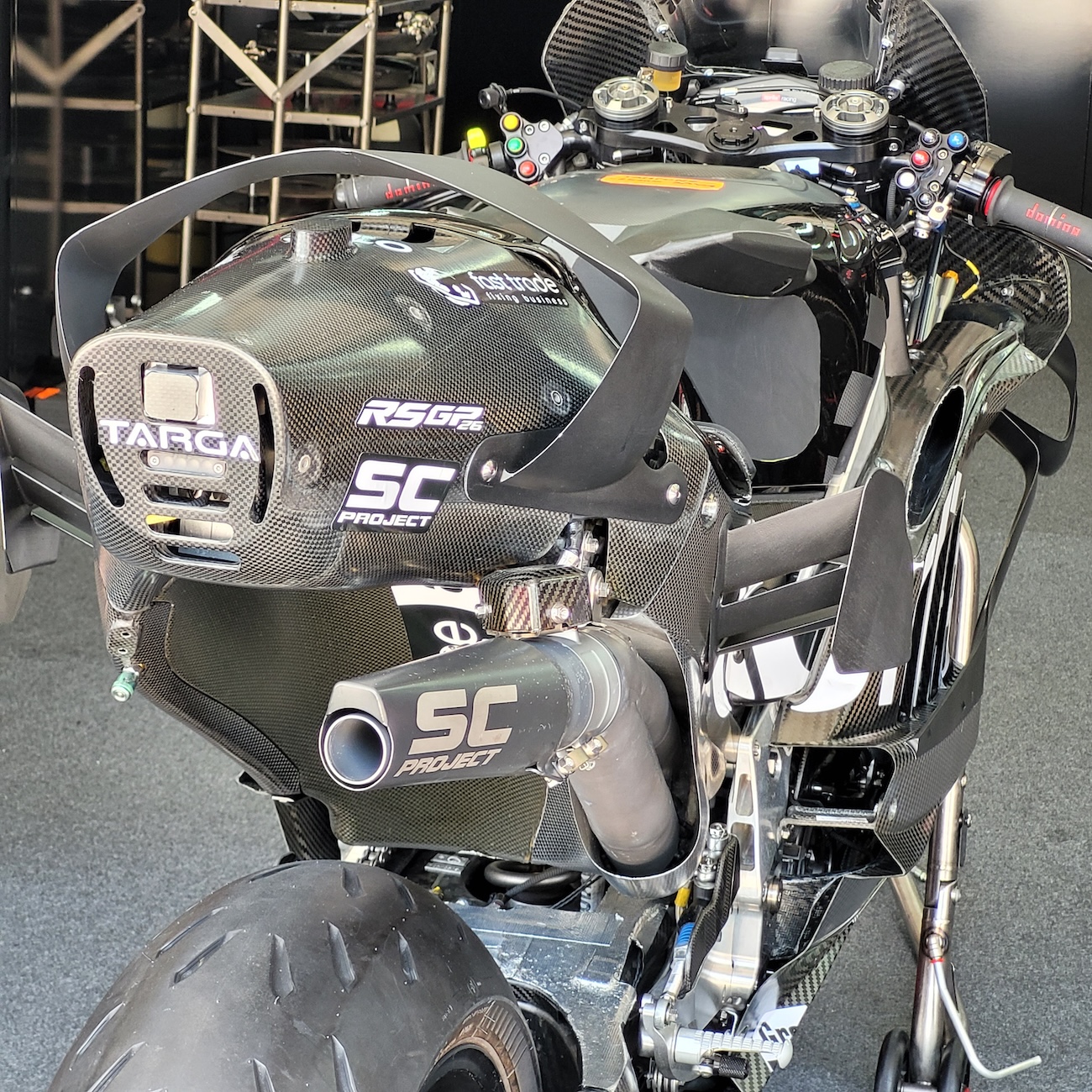 Aprilia RS-GP na sezon 2026 otrzymała nową ramę, która zapewnia wyraźnie spokojniejszy i bardziej przewidywalny feedback dla kierowcy. Zmieniono także aerodynamikę – szczególnie przednie skrzydełka w stylu znanym z KTM-a. Mają one współpracować z bardziej agresywnymi skrzydełkami w dolnej części owiewek, które teraz mają trzy płaty zamiast dwóch.