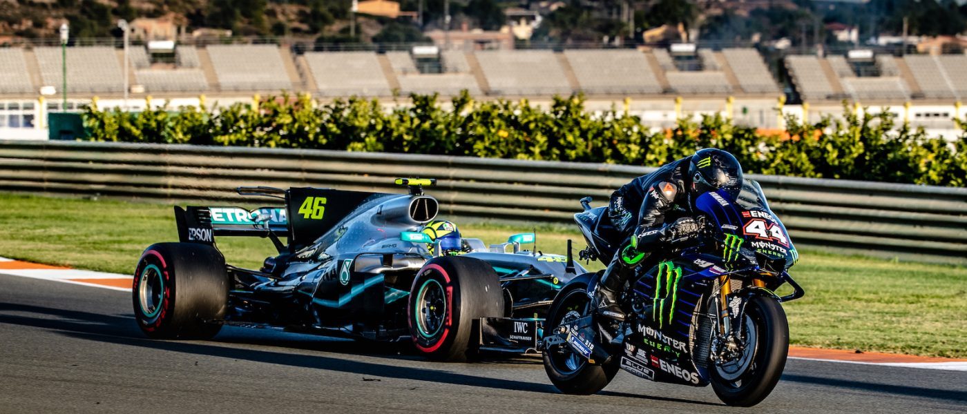 Lewis Hamilton i Valentino Rossi podczas nietypowej przejażdżki w Walencji w 2019 roku