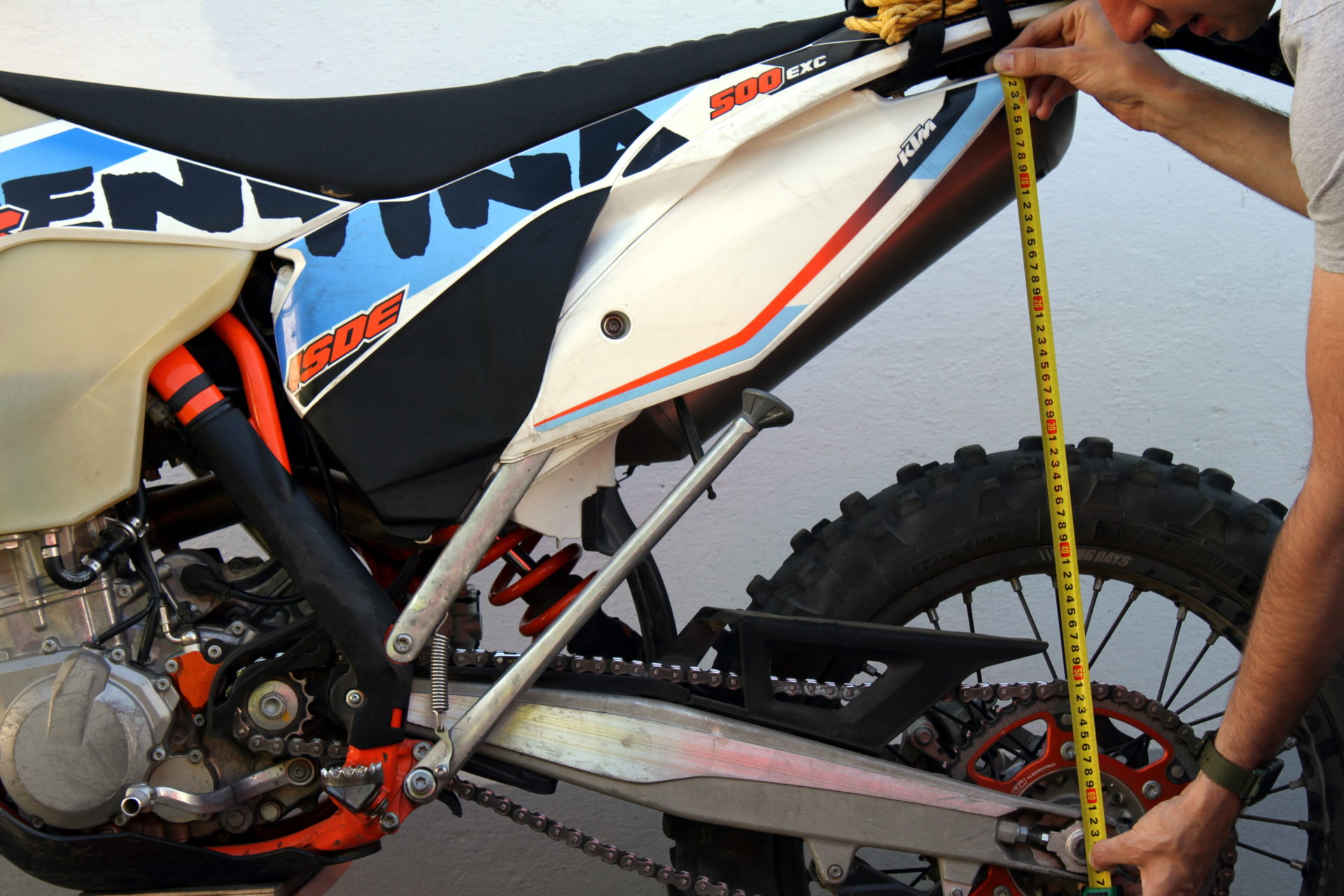 Powtarzamy pomiar stosując wcześniej opisaną metodologię, zapisujemy i odejmujemy go od poprzednio wykonanego pomiaru na podnośniku. Wynik powyższego działania powinien zawierać się w przedziale od 3 cm do 3,5 cm w motocyklach japońskich z tzw. kiwaczką, natomiast w motocyklach KTM z systemem mocowania zawieszenia PDS od 3,5 cm do 4 cm (dla pewności proponujemy ponownie zajrzeć do instrukcji waszego motocykla). Jeżeli wynik znajduje się poniżej lub powyżej skali, musimy odpowiednio zmniejszyć lub zwiększyć napięcie wstępne sprężyny (pkt. 3).