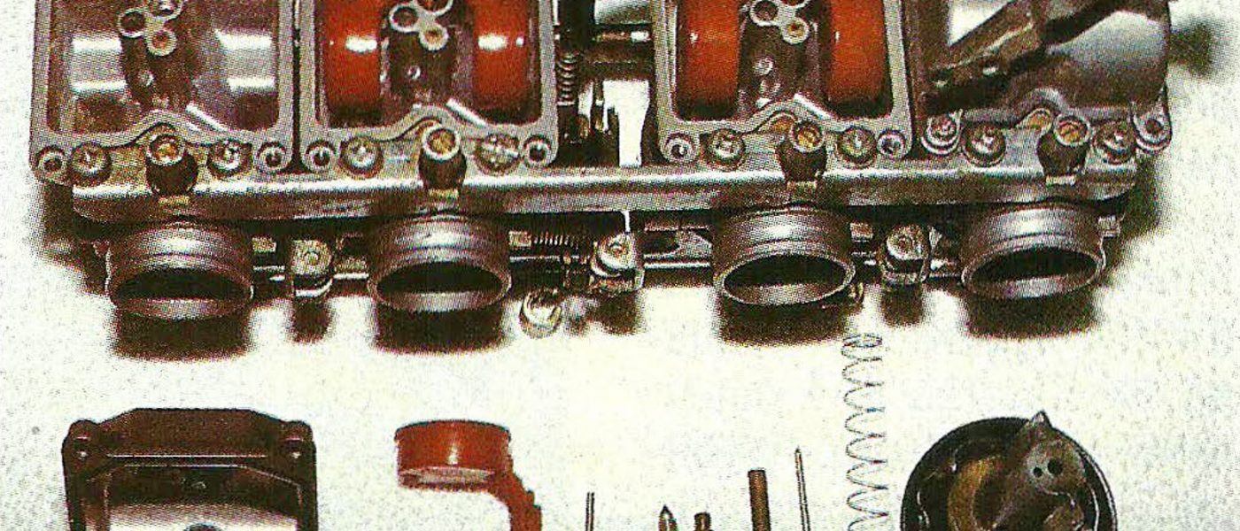 W pierwszej kolejności należy sprawdzić, czy wszystkie przepustnice podnoszą się jednakowo łatwo. Jeśli tak, nie należy demontować górnych pokryw i wyjmować przepustnic z membranami. Jeśli konieczność taka zaistnieje, należy postępować bardzo ostrożnie, aby nie uszkodzić membran i zwrócić szczególną uwagę na ich poprawny montaż. Następnie odwracamy gaźniki „do góry nogami” i odkręcamy komory pływakowe. Po odkręceniu komór pływakowych sprawdzamy, czy poziom paliwa we wszystkich 4 gaźnikach ustawiony jest prawidłowo (patrz książka serwisowa, warto ją mieć, choć kosztuje ok. 50 $). W razie potrzeby korygujemy ustawienie poziomu paliwa ustawiając odpowiednio blaszki przymocowane do pływaków. Jeśli jednak widok pływaków (ich blaszek regulacyjnych) nie wskazuje na to, że ktoś już przy tym ,,majstrował”, najprawdopodobniej nie będziemy musieli tu nic ruszać.