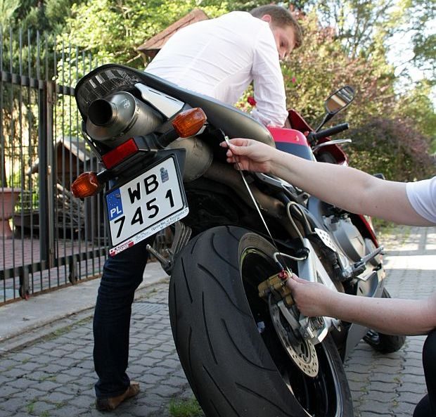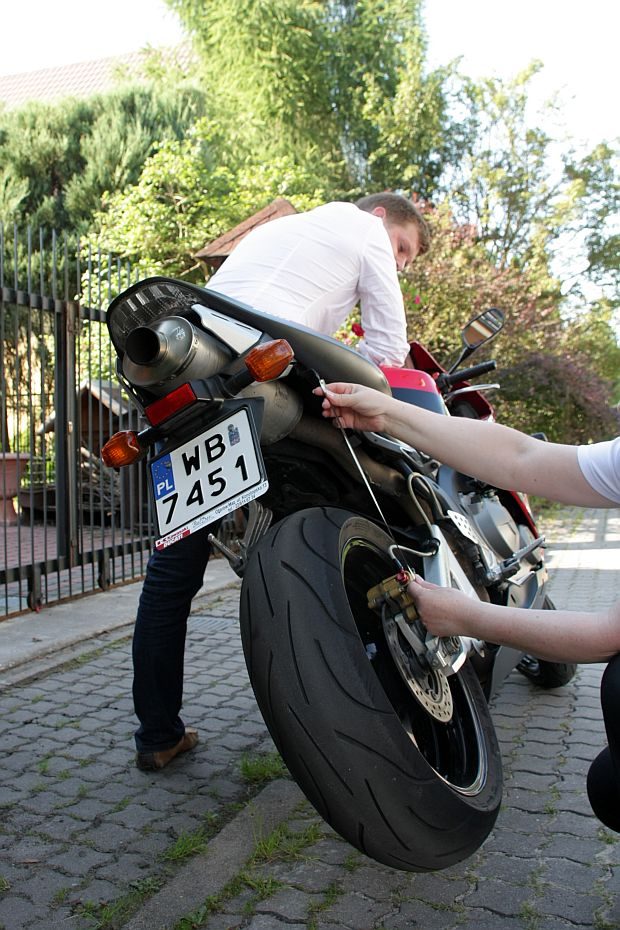 Najpierw trzeba przygotować miarkę (raczej dość giętką, może być nawet centymetr krawiecki) i zapewnić sobie pomoc trzech osób (jedna silna zastąpi dwie z nich). Potem – wyznaczyć dwa punkty leżące na teleskopie amortyzatora lub w jego bezpośredniej bliskości. Jeden ruchomy, tzn. taki, którego położenie zmienia się wraz z ugięciem zawieszenia (np. dolna półka w miejscu osadzenia rury), drugi nieruchomy (np. podstawa mocowania zacisku hamulcowego). Najpierw musimy zmierzyć odległość między powyższymi punktami wtedy, gdy zawieszenie jest w pełni odciążone, czyli koło wisi nad ziemią. Mając centralną podstawkę prosimy ciężką osobę o dociśnięcie tyłu, w przypadku bocznej podstawki – silna osoba stojąca po lewej przechyla motocykl w swoim kierunku tak, by koło oderwało się od ziemi. Wartość pomiaru zapisujemy. Dobrze żeby pomiary robił inteligentny pomocnik, bo my za chwilę będziemy potrzebni gdzie indziej.