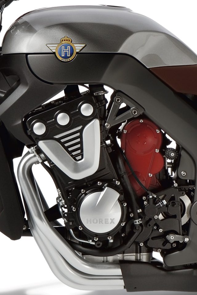 Cylindry rozchylone pod niewielkim kątem, w przypadku Horexa jest to 150 stopni, osadzone są w tym samym korpusie. Mamy więc coś w rodzaju zestawienia trzech silników V2 w jednej obudowie. Uzyskuje się w ten sposób niezwykle zwartą konstrukcję. W przypadku sześciocylindrowca Horexa szerokość jednostki napędowej o pojemności skokowej 1200 ccm wynosi zaledwie 430 mm. Kolejne szczegóły też są dość ciekawe. O ile trzy zawory na cylinder nie robią większego wrażenia, to trzy wałki rozrządu już tak. To oryginalne rozwiązanie określono skrótem TOHC (Triple Overhead Camshaft). Kolejne interesujące detale to tłoki z ukośnie ukształtowanymi denkami i sprężarka doładowująca napędzana paskiem zębatym. Moment obrotowy przenoszony jest na tylne koło poprzez sześciostopniową skrzynię biegów i pasek zębaty. Moc maksymalna w różnych wersjach będzie oscylować między 175 a 200 KM. Prędkość maksymalna zostanie ograniczona do 250 km/h.