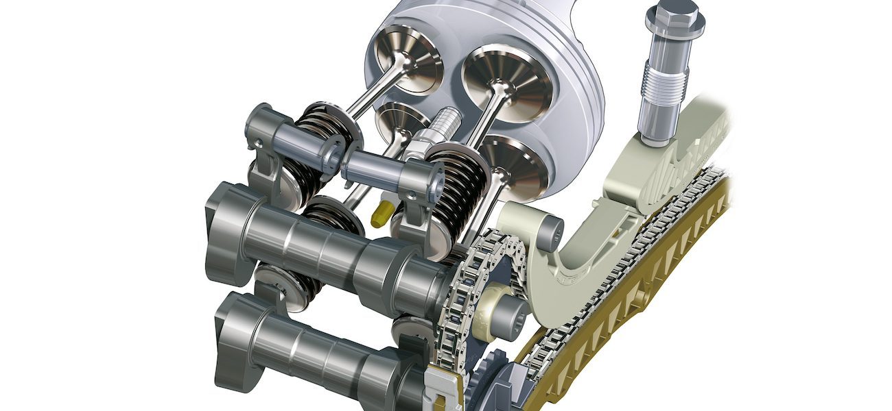 Sferyczna komora spalania w siniku DOHC BMW powstała dzięki skośnym krzywkom pracującym na dźwigienkach