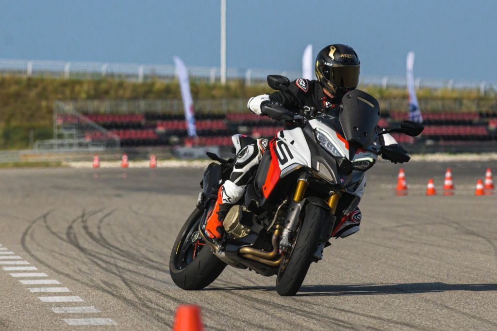 Dla równowagi, bardziej odpowiadał mi ABS w Ducati. BMW ma system stabilizacji, którego nie da się wyłączyć. Oznacza to, że zbliżając się w uślizgu do zakrętu, komputer w pewnym momencie ingeruje i wprowadza korektę. W praktyce przekłada się to na lepszy czas okrążenia, ale nieco zabija frajdę (jeśli ktoś chce walić boczury ponad 230-kilogramowym sprzętem). Skrzynie biegów w obydwu motocyklach działały rewelacyjnie, a dźwięk każdy musi ocenić sam. Niektórzy zachwycali się grzmiącym Ducati, inni cieszyli się z wrzeszczącego BMW. Co najważniejsze, obydwa motocykle łapały się w normach głośności Toru Poznań.