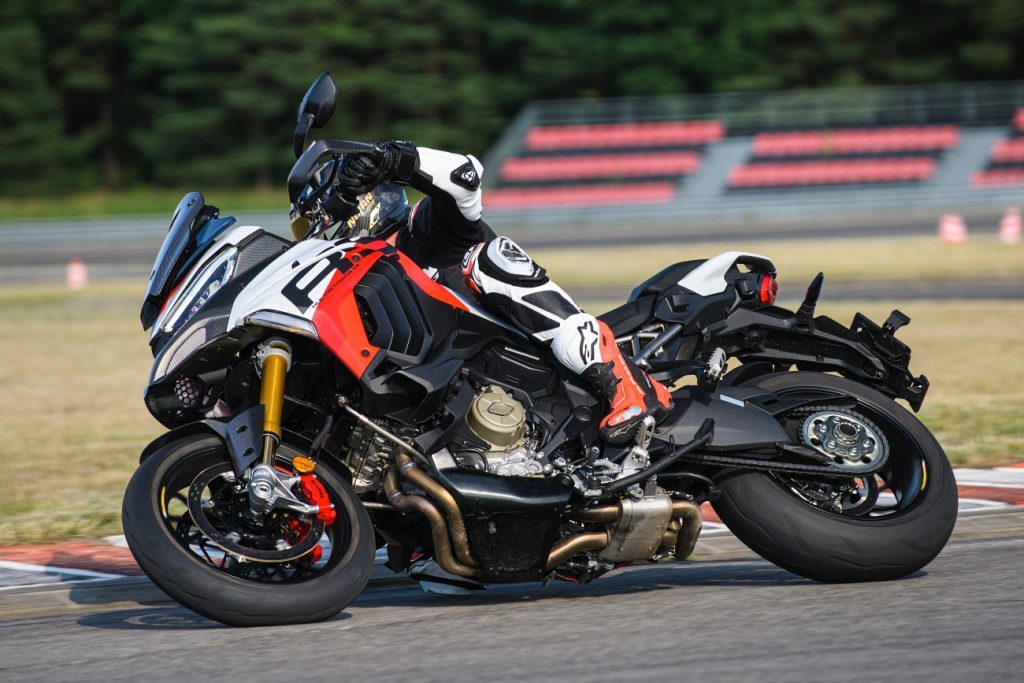Na mniejszym torze jest już o wiele łatwiej. Dosłownie kilka dni później prowadziliśmy szkolenie „Szybko tam, gdzie wolno” i nawijaliśmy kółka po Autodromie Jastrząb. Nitka na tym obiekcie jest czymś pomiędzy torem kartingowym a torem w Poznaniu. Kamil wciąż rozpędzał tam XR-a do 200 km/h, ale średnia prędkość w zakrętach była zdecydowanie mniejsza. Oznacza to mniejsze siły działające na podwozie i nagle cała walka z ciężkim motocyklem odeszła w zapomnienie. Na tym samym obiekcie miałem okazję po raz pierwszy poznać Ducati Multistradę V4 RS.