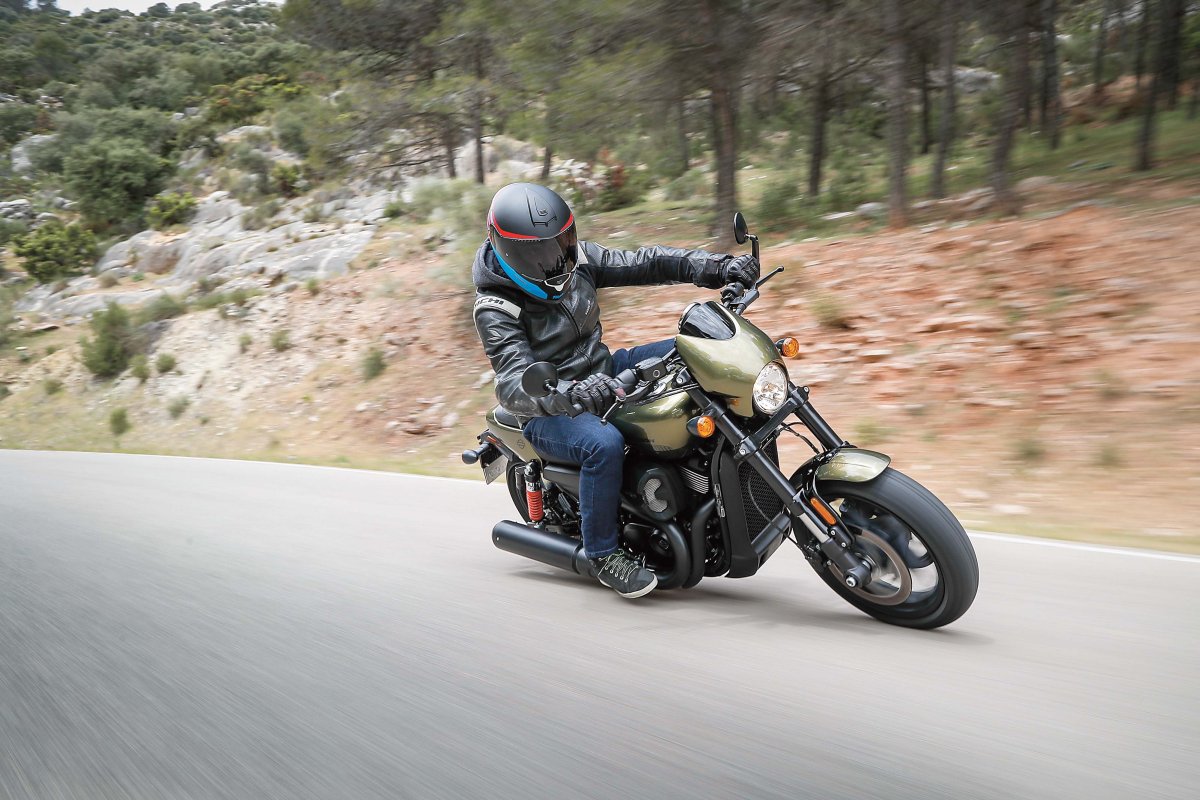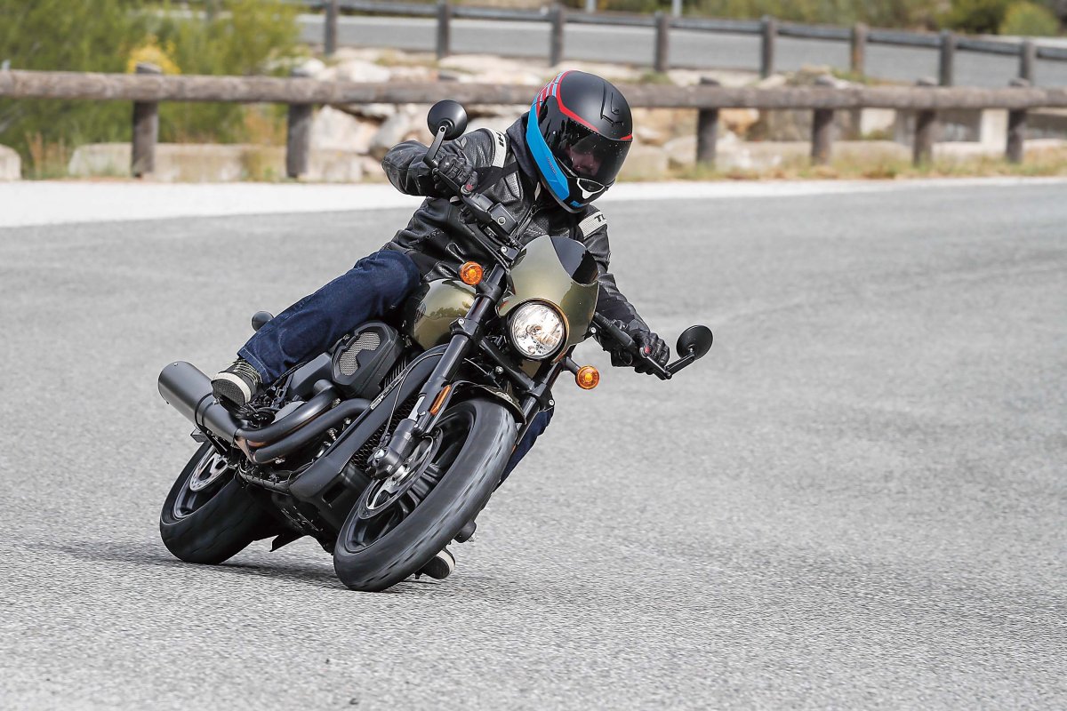 Street Rod reklamowany jest jako H-D, który może szybko atakować zakręty. Od razu to zweryfikowaliśmy. Kąt główki ramy jest typowy dla motocykli typu naked bike, a podwozie ma na tyle duży prześwit, że możemy osiągnąć kąt złożenia dochodzący do 40 stopni. I to nawet działa! Motocykl lekki nie jest, bo gotowy do jazdy waży prawie 240 kilogramów, ale sprytnie ukrywa tę masę. Nie musimy wkładać żadnego