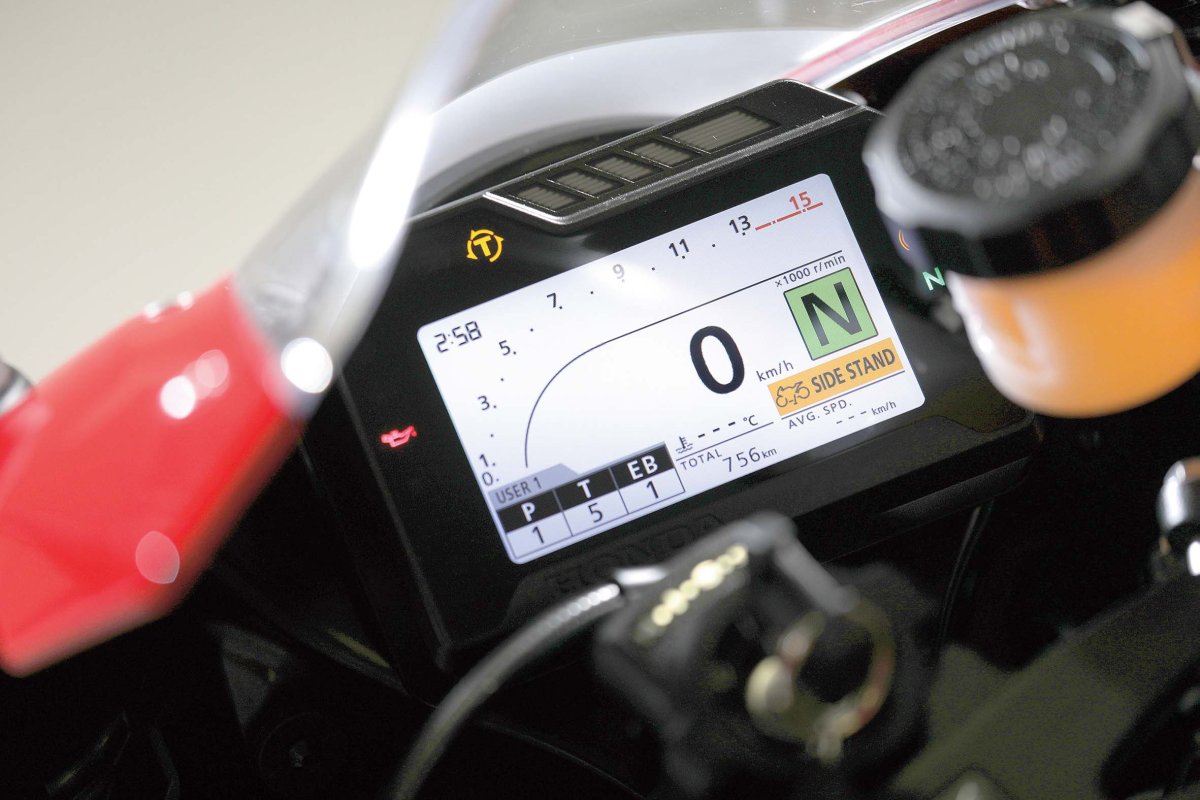 ABS nie da się wyłączyć z poziomu zegarów, więc przy ostrej jeździe na slickach pewnie wielu zdecyduje się na usunięcie bezpiecznika, tak jak ma to miejsce w Kawasaki ZX-10R. Kontrolę trakcji nazwano HSTC (Honda Selectable Torque Control). Pochodzi z modelu RC213V-S. Pierwsze trzy stopnie służą jeździe torowej, kolejne trzy „lataniu” po krętych drogach, a trzy pozostałe mają nas wspomagać przy jeździe w warunkach niskiej przyczepności w mieście i poza nim.