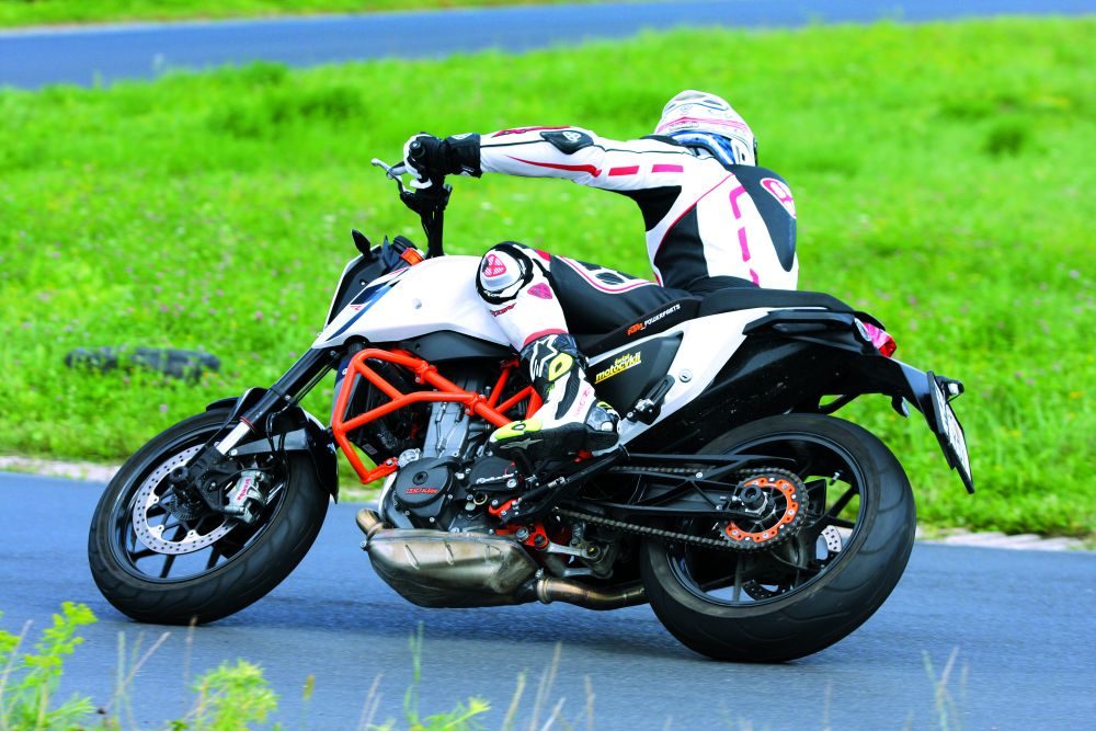 KTM 690 Duke R z 2015 roku równie niepozornie jeździ, jak wygląda. Nie wzbudzał specjalnego zainteresowania w parku maszyn, a pierwsze kółka nie zapowiadały szczególnie emocjonującej zabawy. Nieważne, czy korzystałem ze średniego zakresu obrotów, czy kręciłem silnik do odciny, efekt był mniej więcej taki sam. Zero fajerwerków, zwykłe przyspieszanie. Takie samo wrażenie miałem podczas pokonywania zakrętów. Owszem, motocykl bardzo szybko zmienia kierunki, jednak prędkość w winklach nie była rewelacyjna. Relatywnie wysoko umieszczony środek ciężkości sprawia, że nie czujemy wysokiej pewności w złożeniu. Kiedy próbowałem osiągnąć większy kąt pochyłu, poczułem jak zaczyna ślizgać się przednia opona. Z racji tego, że KTM jako jedyny producent wyznaje zasadę zepsujesz-kupujesz, wolałem nie przekraczać granicy bezpieczeństwa. Mimo tego, że nie czułem się zbyt szybki na torze, jakimś sposobem wyprzedziłem każdy motocykl, który napotkałem przed sobą. Jak poznałem limit przyczepności, a manetkę gazu traktowałem dość brutalnie, okazało się, że KTM pokonuje kolejne okrążenia z przyzwoitym czasem. Rewelacyjnie spisywał się układ hamulcowy Brembo. Siła, którą oferuje pojedyncza tarcza i radialny zacisk nie pozostawia żadnych życzeń. Szkoda tylko, że przednia pompa ma tłoczek o średnicy 19 mm. Taki typ pompy zazwyczaj znajduje się w maszynach wyposażonych w dwa zaciski. Efekt jest taki, że klamka jest dość twarda, a hebel mocno reaguje nawet na mały ruch. Cierpi na tym dozowalność układu. Po wyłączeniu ABS musimy rozsądnie operować przednim hamulcem.
