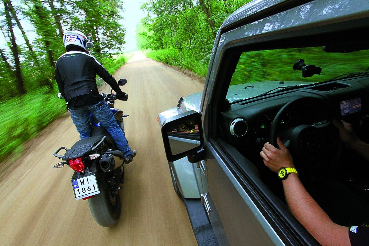 Wrangler w wersji, która wzięła udział w teście, to wydatek bliski 200 000 złotych. Dlatego po wjeździe w leśną drogę kierowca kazał wysiadać pasażerom i przytrzymywać gałęzie, żeby przypadkiem nie podrapały lakieru… W tym czasie ja napędzałem się Triumphem, martwiąc się tylko tym, żeby wspomnianą gałęzią nie zarobić w twarz. Na motocyklu odważniej atakujemy przeszkody. Gdy naszym oczom ukazały się połacie piachu, mogłem zaryzykować przeprawę. Oczywiście poległem i musiałem wypychać motocykl, ale przynajmniej mogłem to zrobić samodzielnie. Gdyby Jeep zakopał się po wahacze, to chyba musielibyśmy wzywać wojsko.