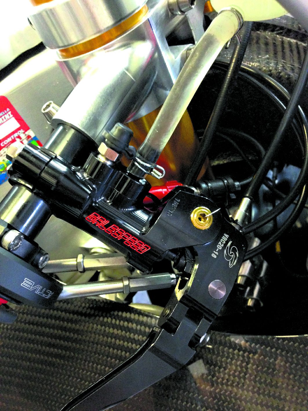 Zaciski głównie pochodzą od Brembo, ale możemy również zauważyć produkty Nissin. Zaciekawiła mnie pompa hamulcowa w Kalexie zespołu Dynavolt. Pierwszy raz spotkałem się z marką Galespeed. To japońska manufaktura wysoce wyspecjalizowana w częściach wyścigowych.