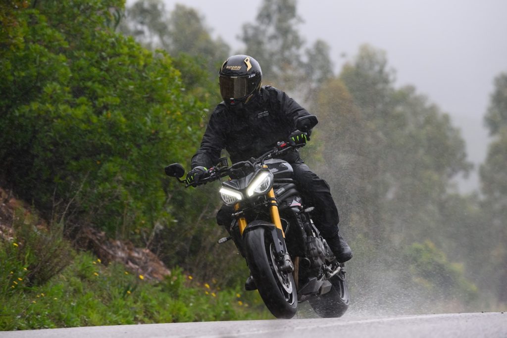 Test Speed Tripla rozbito na dwa dni. Pierwszy to jazda po drogach, drugi – upalanie na torze. Pogoda nas nie oszczędziła. Po przejechaniu 5 kilometrów zatrzymaliśmy się ubrać kondony przeciwdeszczowe. Cały dzień minął na testowaniu grzanych manetek, cornering ABS’u i kontroli trakcji. Jedna rzecz od razu dała się wyczuć. Silnik jest wyraźnie gładszy, przyjemniejszy i silniejszy w niskim i średnim zakresie obrotów. Nie jest to przeskok, który spowodowałby chęć wymiany mojego motocykla na nowy, ale wyższa kultura pracy jest odczuwalna. Dało się to zauważyć przede wszystkim w ciężkich warunkach pogodowych, gdzie dosłownie cały dzień pieściłem się z manetką. Panowie z Triumpha opowiadali, że nowa kalibracja nie byłaby możliwa bez wiedzy, którą wyciągają z serii Moto2. Triumph od lat dostarcza silniki do prototypowych maszyn mistrzostw świata, pozyskując w zamian informacje od najlepszych zespołów i najszybszych zawodników. Ja im wierzę, bo na własnej skórze czułem, jak Ducati (top w MotoGP) potrafi odmienić charakter silnika, stosując jedynie zmiany w jego zarządzaniu.