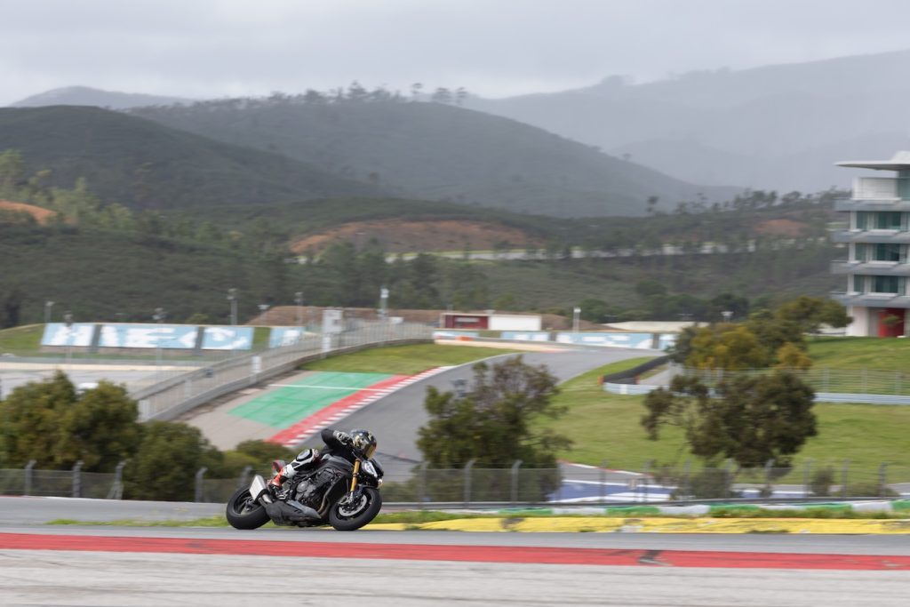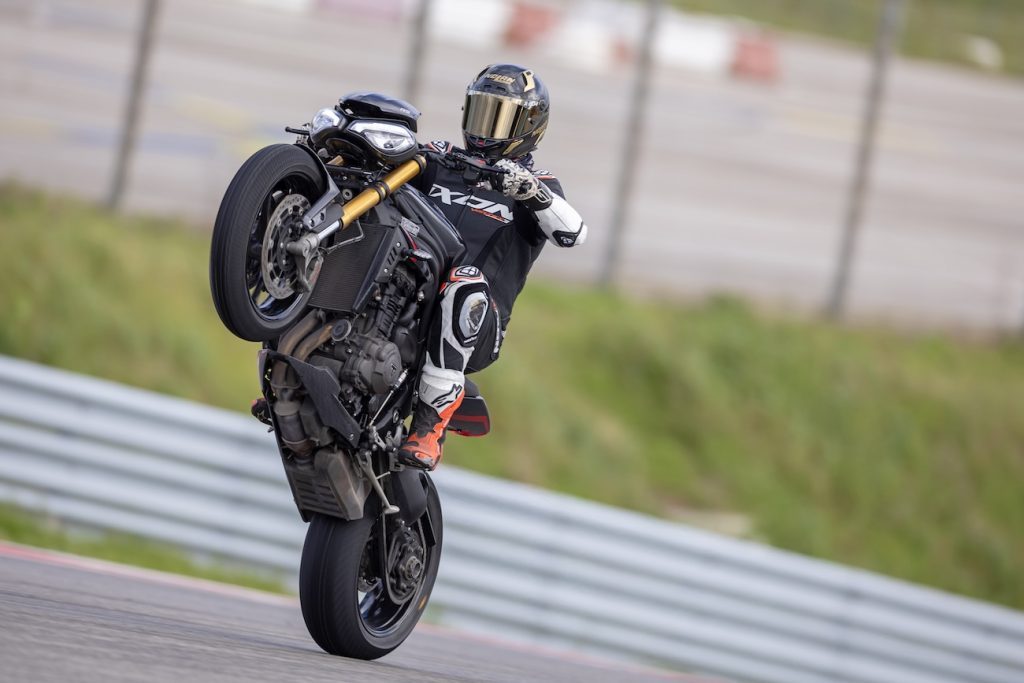 Moje narzekanie ma na celu wskazanie ludziom w Triumphie miejsca, gdzie mogą ulepszyć motocykl. Jeżdżąc swoją maszyną po suchym, nie miałem żadnych obiekcji do działania kontroli trakcji w trybie torowym. W realnym życiu nikt nie będzie jeździł tym motocyklem tak szybko w deszczu, żeby kontrola trakcji go ograniczała. Jeśli ktoś jest aż takim świrem, że zabierze go na tor na oponach typu wet i będzie się nim ścigał, to najprawdopodobniej całkowicie wyłączy kontrolę trakcji. Ja bym tak zrobił, bo prowadzenie, wyczucie przyczepności i precyzja operowania gazem w tym motocyklu jest tak genialna, że to mogłoby się udać… Większym problemem jest wheelie, a właściwie Lift Control. Tak Triumph nazwał swój system kontroli unoszenia przedniego koła. Mam z tym dwa problemy. Jeden praktyczny, drugi ideologiczny. Otóż system jest sprzężony z kontrolą trakcji. Oznacza to, że nie da się wyłączyć Lift Control, pozostawiając kontrolę trakcji włączoną. Triumph wybrał idealny tor, żeby obnażyć tę niedoskonałość.