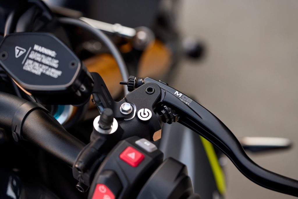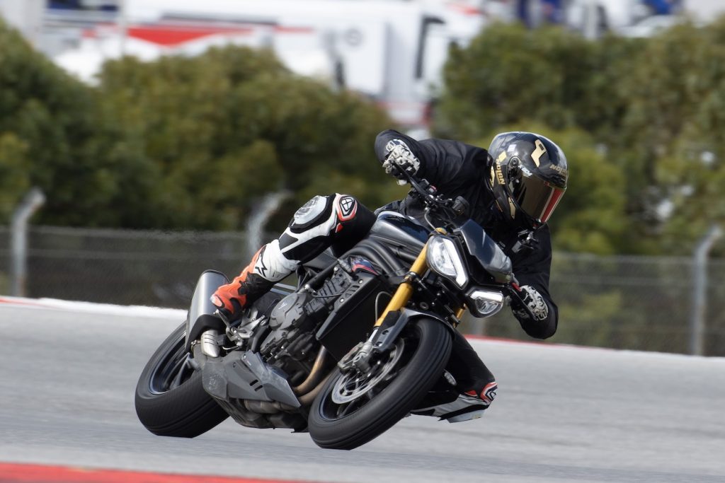 Jednostka napędowa nie przeszła żadnych zmian mechanicznych. Przekonstruowany został za to układ wydechowy i na nowo skalibrowano silnik. Spełniając normy emisji spalin Euro 5+ motocykl nie stracił, a wręcz zyskał nieco mocy. Generuje teraz 183 konie mechaniczne (+3 KM) i 128 niutonometrów (+3 Nm) momentu obrotowego. Co najważniejsze dodatkowe „niuty” pojawiły się w niskim zakresie obrotów. Wartość i charakterystyka oddawania momentu obrotowego jest kluczowa w tym segmencie, bo przez brak osłony przed wiatrem, relatywnie rzadko korzystamy z mocy maksymalnej. W tej kategorii Speed wypada nieźle na tle konkurencji. BMW S 1000 R i M 1000 R generują 114 i 113 Nm, a Ducati Streetfighter V4S i Aprilia Tuono V4 odpowiednio 121 i 120 Nm. Oczywiście każdy z tych motocykli ma nieco inną pojemność silnika, bo nie reguluje jej żadna seria wyścigowa. Każdy robi co chce, a Triumpha może przebić jedynie KTM, którego dwucylindrowy silnik o pojemności 1350 ccm generuje aż 145 Nm! Uczciwie trzeba oddać, że zarówno Ducati, jak i BMW w wersji M produkują o wiele więcej mocy, ale to już Wasza sprawa, z jaką graniczną prędkością chcecie podróżować do pracy.
