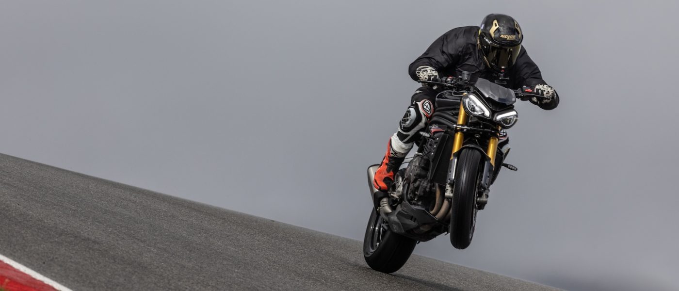 Moje narzekanie ma na celu wskazanie ludziom w Triumphie miejsca, gdzie mogą ulepszyć motocykl. Jeżdżąc swoją maszyną po suchym, nie miałem żadnych obiekcji do działania kontroli trakcji w trybie torowym. W realnym życiu nikt nie będzie jeździł tym motocyklem tak szybko w deszczu, żeby kontrola trakcji go ograniczała. Jeśli ktoś jest aż takim świrem, że zabierze go na tor na oponach typu wet i będzie się nim ścigał, to najprawdopodobniej całkowicie wyłączy kontrolę trakcji. Ja bym tak zrobił, bo prowadzenie, wyczucie przyczepności i precyzja operowania gazem w tym motocyklu jest tak genialna, że to mogłoby się udać… Większym problemem jest wheelie, a właściwie Lift Control. Tak Triumph nazwał swój system kontroli unoszenia przedniego koła. Mam z tym dwa problemy. Jeden praktyczny, drugi ideologiczny. Otóż system jest sprzężony z kontrolą trakcji. Oznacza to, że nie da się wyłączyć Lift Control, pozostawiając kontrolę trakcji włączoną. Triumph wybrał idealny tor, żeby obnażyć tę niedoskonałość.