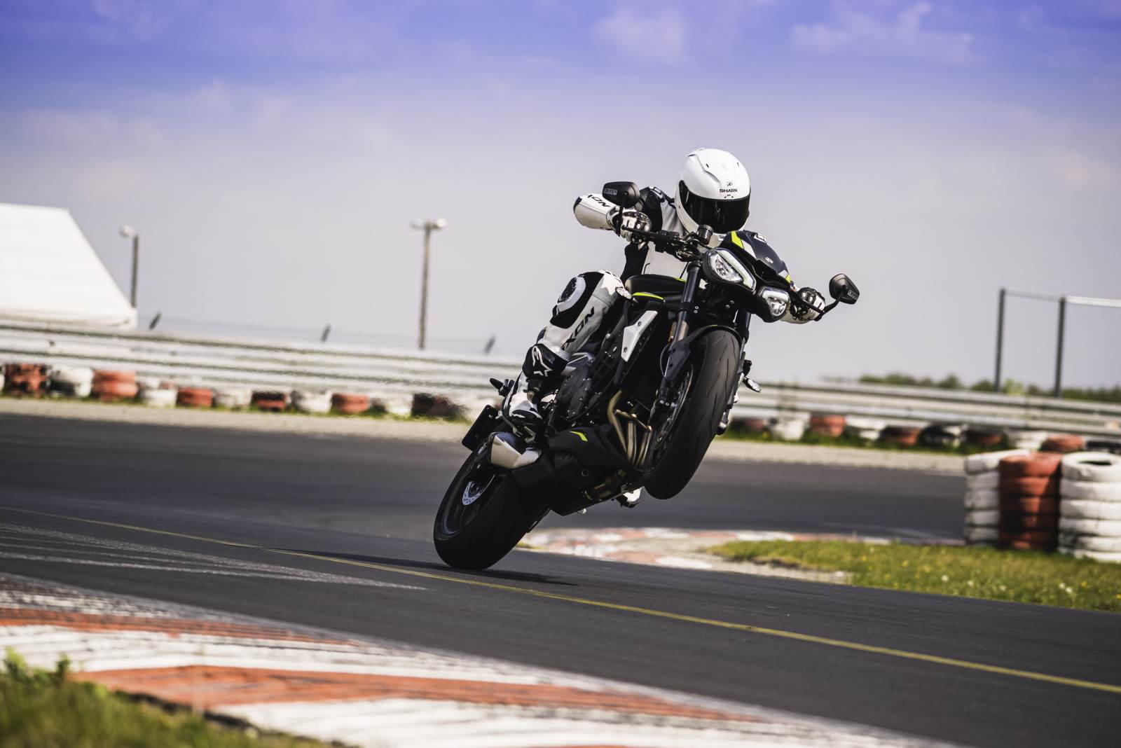 Siła bezwładności elementów silnika spadła o 9%, przez co jednostka szybciej reaguje na dodanie gazu, a na dokładkę dostajemy jeszcze lepszą zwrotność. Ostatecznie dzięki zabiegom w jednostce napędowej zyskujemy nie tylko na osiągach, ale i ogólnym charakterze Street Triple’a. Motocykl skręca niewiarygodnie chętnie. Śmiałem się, bo zanim go wyczułem dojeżdżałem do szczytu zakrętu szybciej niż planowałem. W zmianę kierunków nie musimy wkładać żadnego wysiłku, a gdy poznamy charakter prowadzenia Streeta, będziemy mogli wykorzystać genialną precyzję prowadzenia. Po parunastu minutach ustawiałem motocykl dokładnie w tym miejscu, w którym planowałem, a nawet gdy popełniłem błąd, miałem dużo miejsca na korektę. W jeździe po małym obiekcie najważniejsze jest wyczucie przodu i w przypadku Triumpha nie sprawia to problemu. Rama o przemyślanej geometrii i widelec Showa BPF dają nam dużo informacji o przyczepności i poczucie pewności. Potencjału Ohlinsa nie sposób było zweryfikować, bo stać go na przyjmowanie o wiele większych przeciążeń niż jesteśmy w stanie wygenerować na torze kartingowym. Na szczęście to ten samo amortyzator, który testowałem na dużym torze w Barcelonie i wiem, że radzi sobie z szybką jazdą.