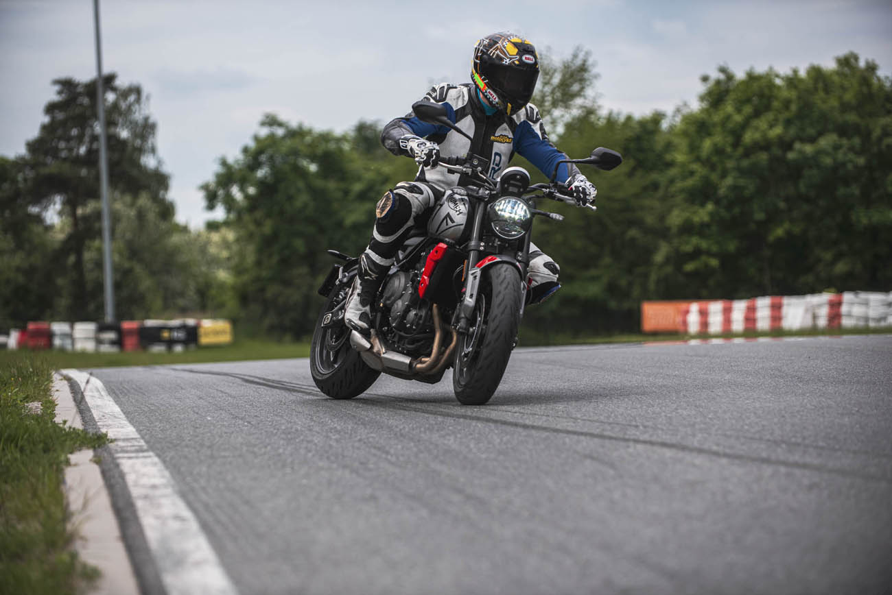 Jest na nim bardzo wygodnie, podnóżki są nisko, zawieszenie miękkie. Ogólnie cacy z punktu A do punktu B. Na torze Trident okazał się być o wiele bardziej ochoczy do zabawy. Filigranowa, stalowa rama świetnie współpracuje z amortyzatorami Showa. Pomimo tego, że do dyspozycji nie mamy praktycznie żadnej regulacji (jedynie napięcia wstępnego tylnej sprężyny), motocykl jechał naprawdę sprawnie i precyzyjnie. Oczywiście na torze w Poznaniu zacząłby się bujać, ale na torze w Modlinie sprawował się rewelacyjnie. Na obiektach ODTJ o wiele łatwiej jest odwzorować warunki, w których ten motocykl będzie realnie używany. Ciasne nawroty, zmiany kierunków, przyspieszanie z niskich prędkości itp.
