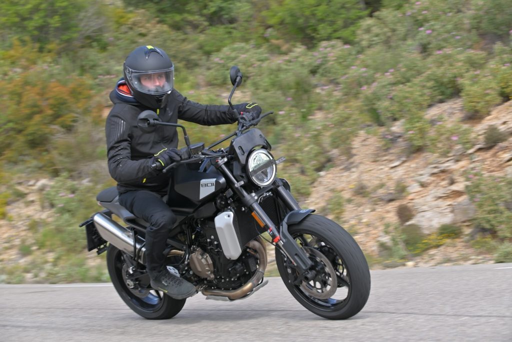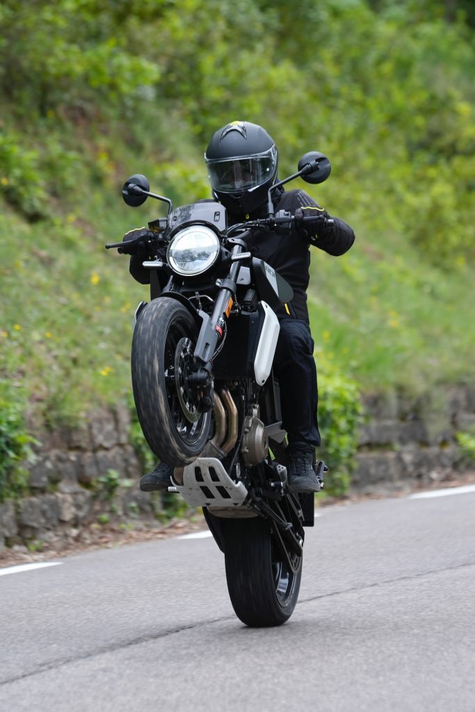Kiedy w końcu wyposażono mnie w ubrania zastępcze (moje własne znów zaginęły na lotnisku) i zasiadłem za sterami nowej Husqvarny, poczułem się jak na małym potulnym lekkim i łatwym do okiełznania motorku. Przy masie 181kg oznacza po prostu, że środek ciężkości znajduje się bardzo nisko. Siedzenie umieszczone jest także bardzo nisko na wysokości 850 mm. Pozycja za kierownicą okazała się wyprostowana i komfortowa z lekkim ukłonem w stronę sportu, ale w żaden sposób nie wyobrażam sobie zajmowania pozycji stojącej przez więcej niż 5 sekund, co oznacza, że możemy tak przejechać przez dwie dziury, ale potem musimy już usiąść. Mam wrażenie, że teoria o scramblerowym rodowodzie jest raczej ideologiczna i motocykl wizualnie ma budzić takie skojarzenia, natomiast w wersji standardowej nie jest to sprzęt na off-road. Charakterystyczne wypustki na zbiorniku paliwa według inżynierów zostały przeprojektowane. W mniejszych modelach wyżsi użytkownicy skarżyli się ponoć, że się pod nimi nie mieszczą. Cały motocykl jest starannie wykonany a teoria projektantów o konieczności ograniczeniu plastiku i osłon została zrealizowana. Wiele elementów jak np. zadupek, to dowód doskonałej roboty wykonanej przez speców od designu. Motocykl może się podobać.