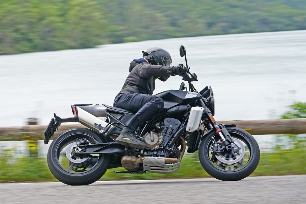 Już pierwsze kilometry i tempo jazdy pokazały, że kręte drogi to żywioł tej osiemsetki. Powiem szczerze, że prawie do samego końca jazd testowych (pokonaliśmy ponad 200 km) zaskakiwało mnie, jak szybko Svartpilen pokonuje zakręty. Opony Pirelli MT 60RS, którym początkowo totalnie nie ufałem, bo optycznie wydawały mi się bardziej szutrowe niż drogowe, były „pozamykane” absolutnie do końca i trzymały bez żadnego problemu. Bardzo przydatne okazały się motylki do regulacji przedniego zawieszenia, gdyż istotnie, bez zatrzymywania się, w bardzo szybki i łatwy sposób utwardziłem sobie tłumienia, aby pewniej dohamować i pokonywać zakręty. Tak, ten ruch Husqvarny polegający na skondensowaniu całej regulacji w 5 klikach i dodaniem „motylków’ do regulacji, to strzał w dziesiątkę. Tylny shock również wyposażono w 5-klikową regulację, lecz tutaj niestety do przestawienia potrzebujemy śrubokręta. Zawieszenia sprawują się bardzo dobrze jak na motocykl, którego cena nawet nie zbliża się do 100 tys. zł. Przy prędkościach, z którymi podróżowaliśmy po zakrętach, były one zmuszone do bardzo ciężkiej pracy. Ale tak jak wspomniałem, w połączeniu z oponami, dawały duże poczucie pewności. Jestem pod wrażeniem stabilności całej ramy i podwozia, a także tego, że mimo wygodnej pozycji i niskiego siodła, nie przycierałem podnóżkami w zakrętach. Bardzo mocnym punktem jest praca skrzyni biegów z dwustronnym quickshifterem. Biegi wchodzą pewnie nawet przy niskiej prędkości, a łatwość wyszukiwania luzu jest jedną z najlepszych, z jakimi miałem w życiu do czynienia. Dobre jest też to, że cały mechanizm quickshiftera jest umieszczony wewnątrz silnika, przez co nie ma ryzyka uszkodzenia go. Mniej zadowoleni z tego faktu mogą być jedynie mechanicy w razie konieczności naprawy. W temacie hamulców, a w zasadzie przedniego hamulca, gdyż jak zawsze w takich maszynach ten tylni jest znacznie mniej wymagający i rzadko sprawia problemy, siła hamowania jest całkiem niezła. Natomiast teoria zastosowania organicznych klocków, w celu zmniejszenia agresywności hamulca, zwiększenia jego wyczucia i polepszenia dozowalnści, może i miałaby sens na szutrach, może na bardzo śliskiej asfaltowej nawierzchni, natomiast w warunkach, w jakich miałem okazję jeździć, brakowało mi właśnie troszkę bardziej agresywnego działania i progresywnego, szybszego przyrostu siły. Mocnym punktem jest to, że mimo intensywnego heblowania, nie zmieniała się jego charakterystyka, a dźwignia była zawsze w tej samej pozycji. Po włączeniu ABS-u w tryb supermoto możemy zrobić efektowne stopie, co Husqa bardzo lubi.