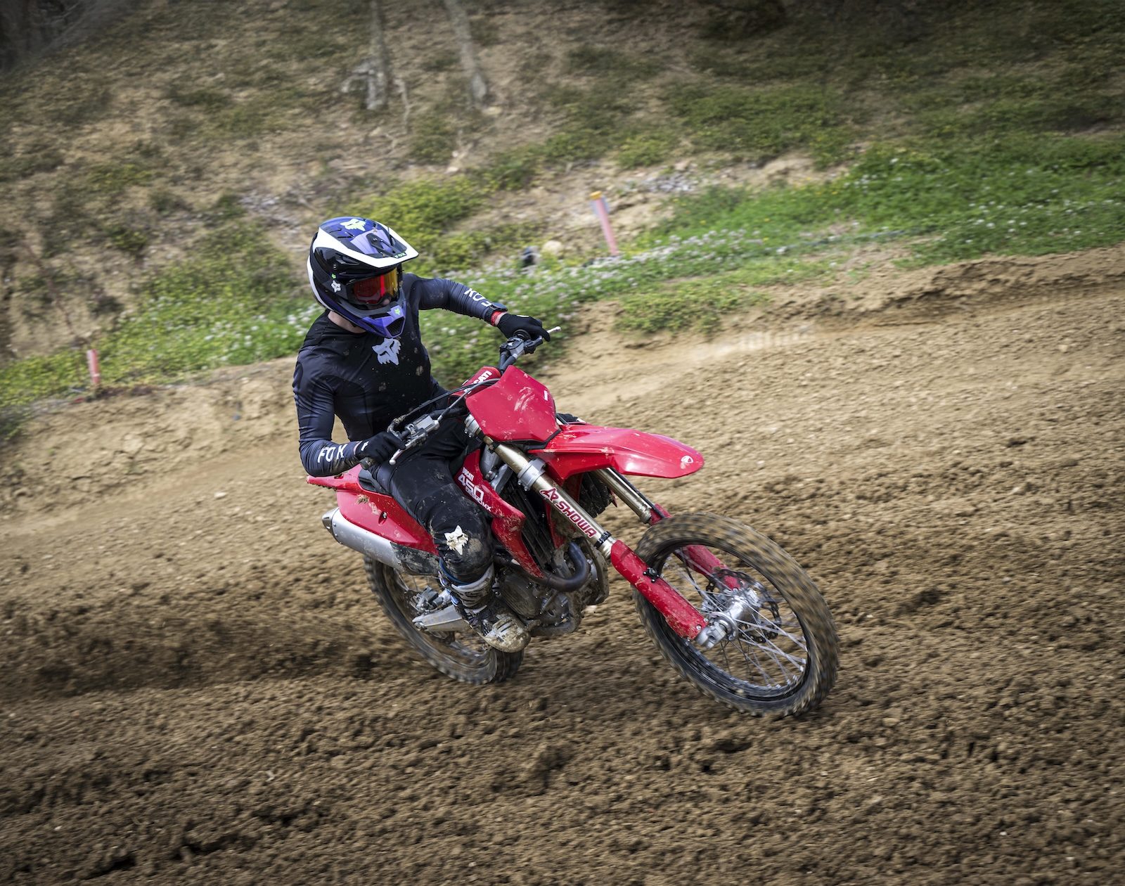 Już po pierwszym przełożeniu nogi przez kanapę motocykla zauważyłem, że pozycja na Desmo450 MX jest nietypowa. Pokusiłbym się o stwierdzenie, że zamiast ergonomii, która ewoluowała latami, czujemy się jak na crossówce nowej generacji. Miałem wrażenie, że motocykl wymusza sylwetkę mocno pochyloną do przodu – gotową do ataku, co zdecydowanie pasuje do „nowej” techniki jazdy. Przy wzroście 180 cm na siedząco czułem się na Ducati wręcz doskonale, jednak jeżdżąc na stojąco, musiałem mocno skupiać się na wciskaniu w dół pięt, bo miałem wrażenie, jakbym stał cały czas na palcach. Nie wiem, czy mógłbym się z tym uporać zmianą pozycji kierownicy (mamy do wyboru cztery opcje), czy trzeba byłoby myśleć o obniżonych podnóżkach. Mimo że miałem do dyspozycji motocykl na wyłączność i inżynierów z kluczami w ciągłej gotowości, to nie pokusiłem się o próby takiego zabiegu. I tak cieszę się, że zdecydowałem się na kliknięcie zawieszenia, które chyba po raz pierwszy w mojej dziennikarskiej karierze było zbyt miękkie na motocrossowym teście. Na początku uznawałem to za zaletę, ale kiedy po wielu przestrzeleniach lądowania, zamknięty zawias nie pozwalał mi na zmieszczenie się w zakręt, dodaliśmy trochę kompresji. Zrobiło się znacznie lepiej, ale nie był to balans, jakiego bym oczekiwał od Ducati, szczególnie po tak fenomenalnym wrażeniach, wywołanym przez silnik i elektronikę.