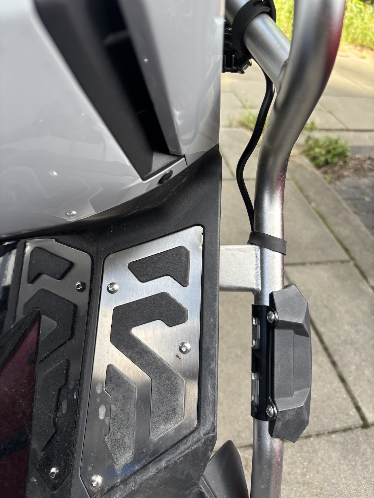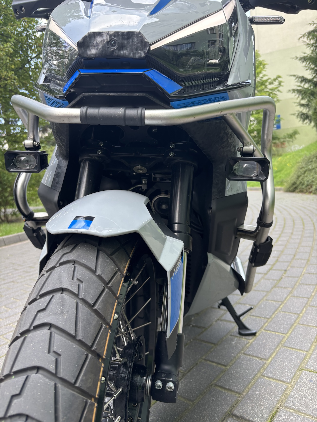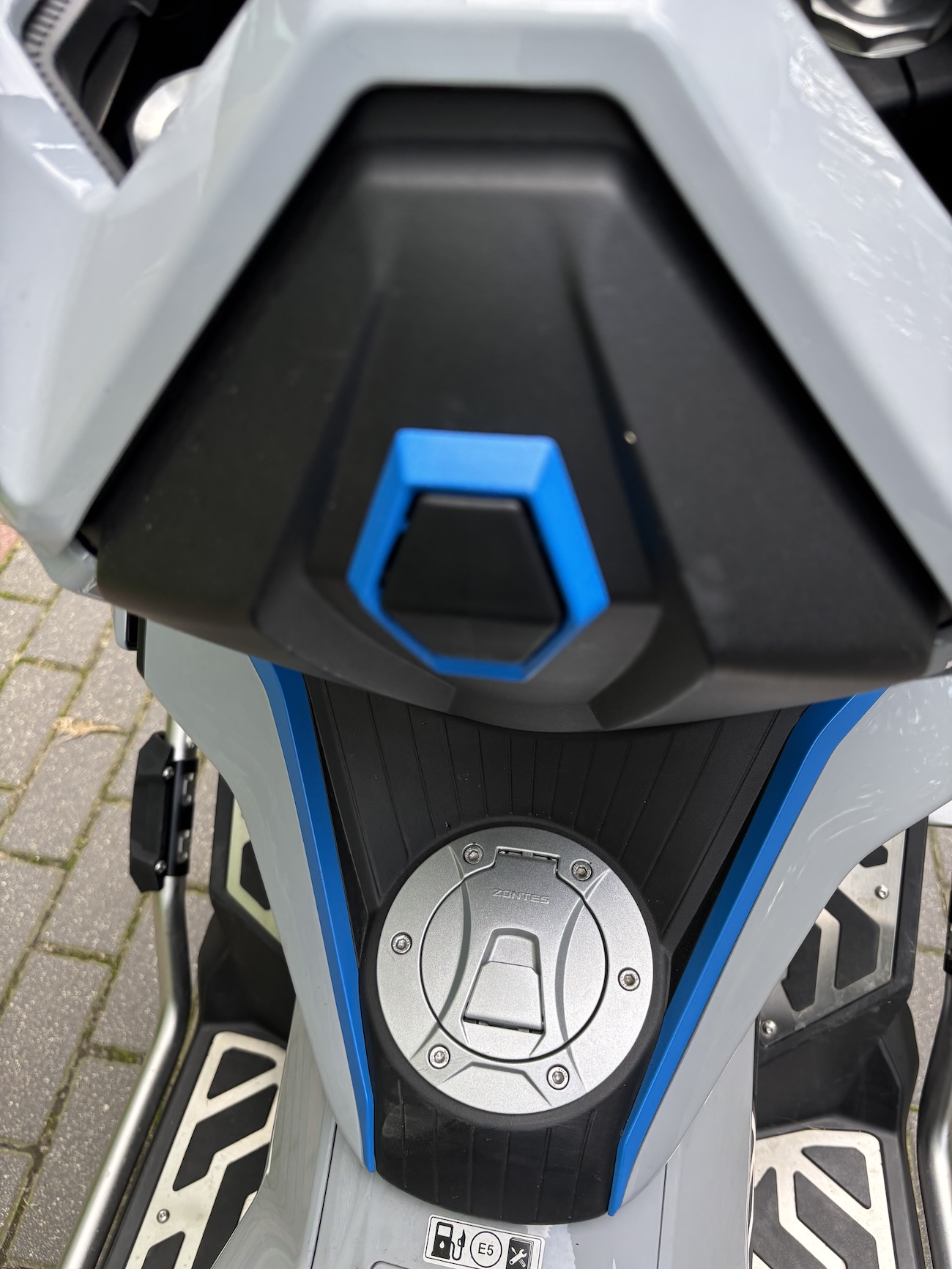 Zontes 368G na co dzień imponuje przede wszystkim praktycznością. Fabrycznie wyposażony jest tak bogato, że konkurencja może tylko zazdrościć. Gmole, handbary, reflektory pomocnicze, sześć portów USB, z czego jedno tuż przy kierownicy – świetne do ładowania telefonu lub nawigacji. Do tego podgrzewane manetki, kontrola ciśnienia w oponach, kontrola trakcji, rejestrator jazdy z możliwością odtwarzania nagrań na ekranie TFT, a nawet możliwość wyświetlenia mapy (choć wymaga to sparowania konta z pojazdem). Jest nawet haczyk na reklamówkę z Biedronki. Ten skuter naprawdę łączy przygodę z codziennością.
