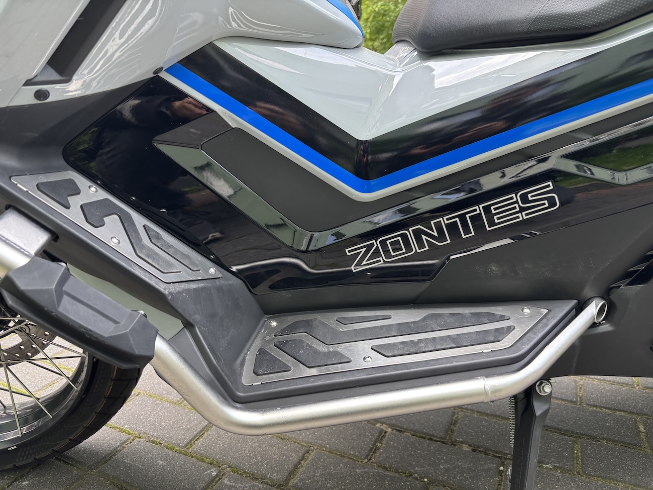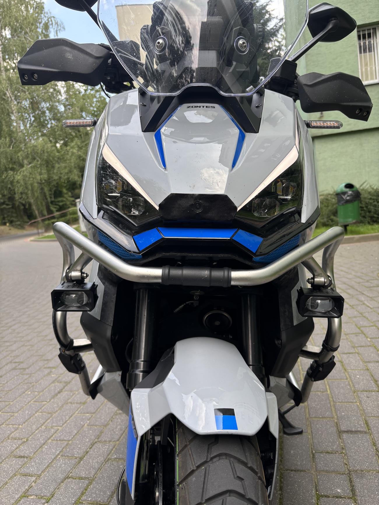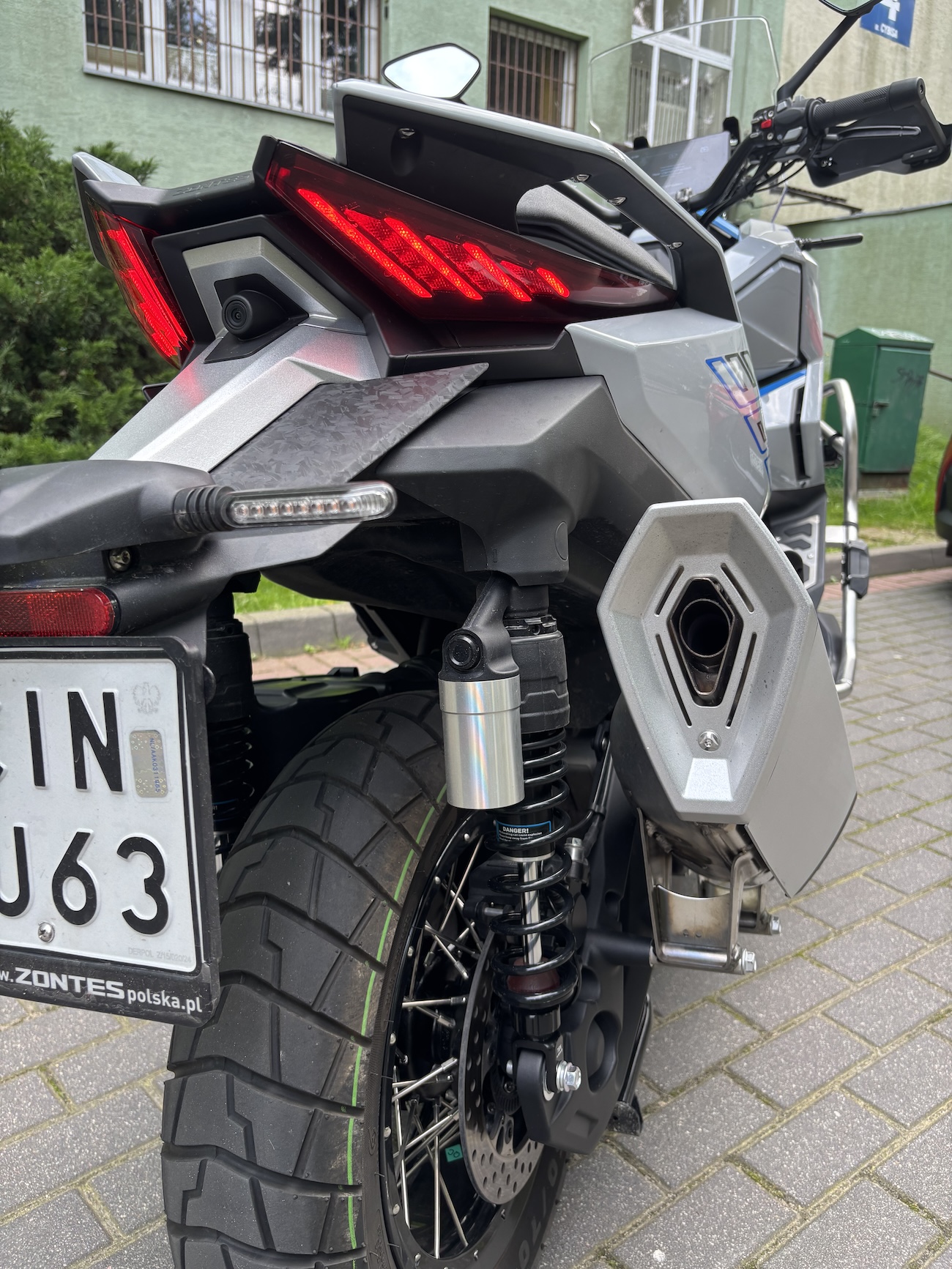 Prowadzenie można określić jako pewne i komfortowe. Układ jezdny dobrze wybiera nierówności, zawieszenie jest zaskakująco skuteczne, a duże koła pomagają utrzymać stabilność przy wyższych prędkościach. Nawet przy 120-130 km/h Zontes zachowuje się dojrzale. Nie traci precyzji prowadzenia, nie myszkuje, nie męczy kierowcy. Dla osoby z mniejszym doświadczeniem motocyklowym może to być wręcz objawienie.