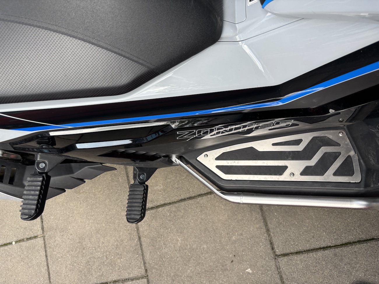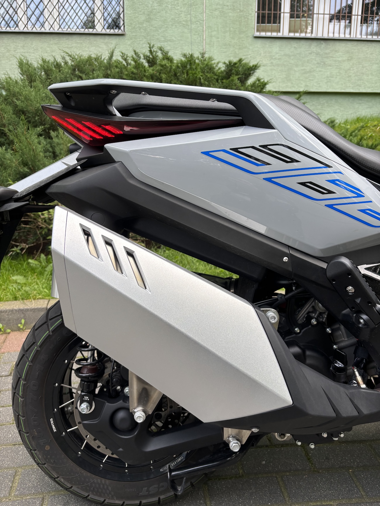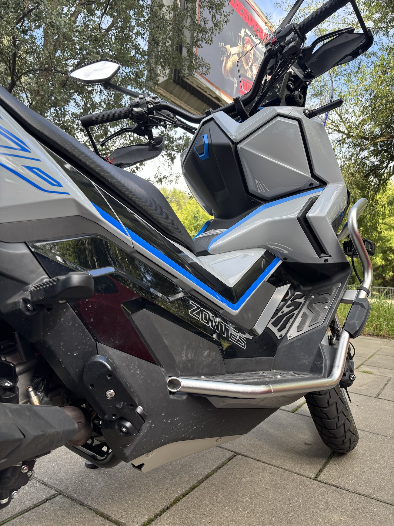 Zontes nie bawi się w półśrodki – stylistyka 368G jest odważna, ostra i wyrazista. Masywna sylwetka z wysoką kierownicą, muskularnymi owiewkami i szprychowanymi kołami może się podobać. Nie udaje „grzecznego mieszczucha” – to skuter, który wygląda jak motocykl i lubi to podkreślać. Siedzi się wysoko, co daje bardzo dobrą widoczność i wrażenie panowania nad sytuacją – to coś, co zwykle zarezerwowane było dla większych jednośladów.