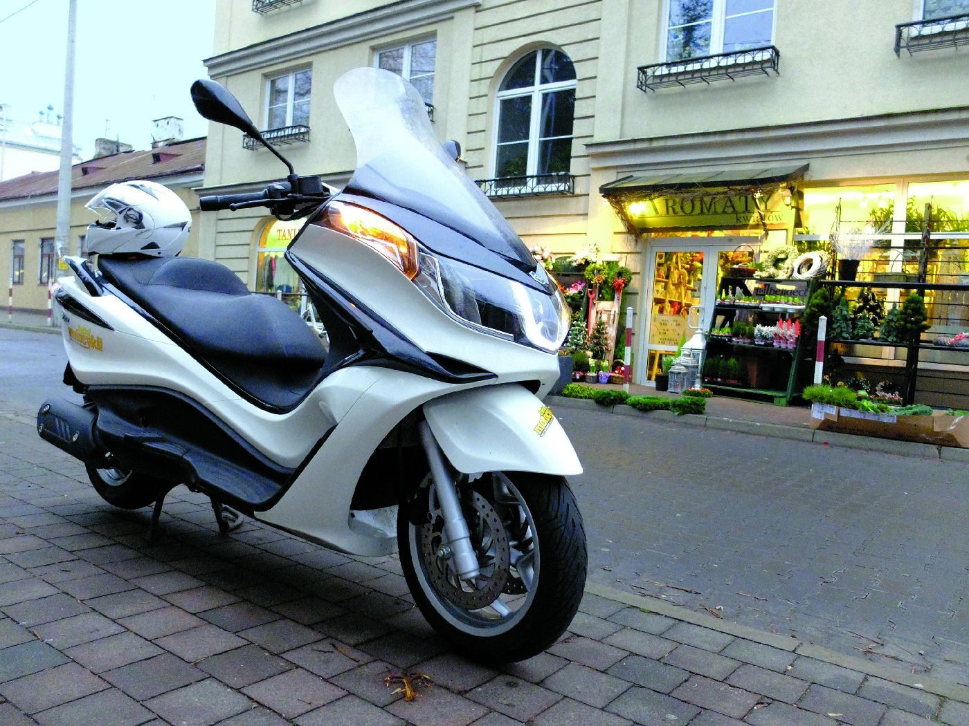 Mamy więc w X10 luksus jak w „mercu”, komfort, przestrzeń dla jadących i sporo miejsca na bagaże. Droższa (o trzy tysiące) wersja jest wyposażona w ABS/ASR. Testowany egzemplarz nie miał tych fanaberii i jakoś mi ich nie brakowało. Pewnym zgrzytem w tak luksusowym skuterze okazał się brak regulacji dźwigni hamulców. Są za daleko od kierownicy i osoby o krótkich palcach będą miały problemy z hamowaniem. W zachwyt nie wpadną też niscy kierowcy, ponieważ szeroka kanapa wymusza spory rozkrok i po zatrzymaniu trudniej dosięgnąć stopami do podłoża.