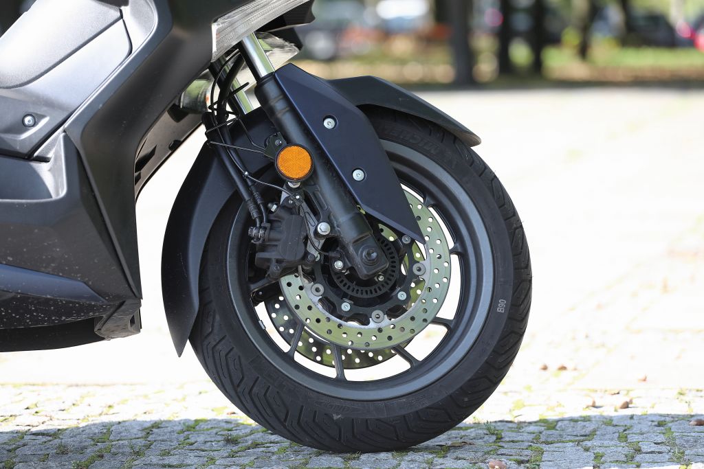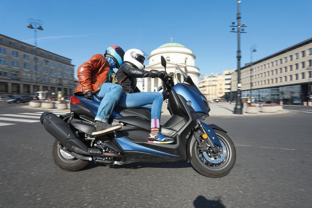 X-Max toczy się na kołach o różnej średnicy. Przednie, 15-calowe, zmniejsza dokuczliwość wpadania w dziury w jezdni, co się bardzo chwali. Tylne ma 13 cali. W ruchu miejskim, ten niezbyt lekki skuter zachowywał się, jakby był o pół numeru mniejszy. Zwinny, zwrotny i wspaniale prowadzący się w każdych warunkach. Twardość i tłumienie zawieszenia skonfigurowano w taki sposób, aby przy zachowaniu doskonałej trakcji dać maksimum komfortu. Skuter jest bardzo dynamiczny i jedyną rzeczą, na którą trzeba zwracać baczną uwagę, jest prędkościomierz. X-Max bardzo chętnie przekracza wszelkie, miejskie ograniczenia. Jazda pozamiejska również daje sporo satysfakcji, gdyż Yamaha może w pełni pokazać swoje możliwości. Pewność, z jaką można pokonywać wszelkiego rodzaju winkle, jest godna najwyższej pochwały. Nie jest to może trakcja na poziomie motocykla sportowego lub TMaksa, ale porównywalna do poziomu motocykla turystycznego.