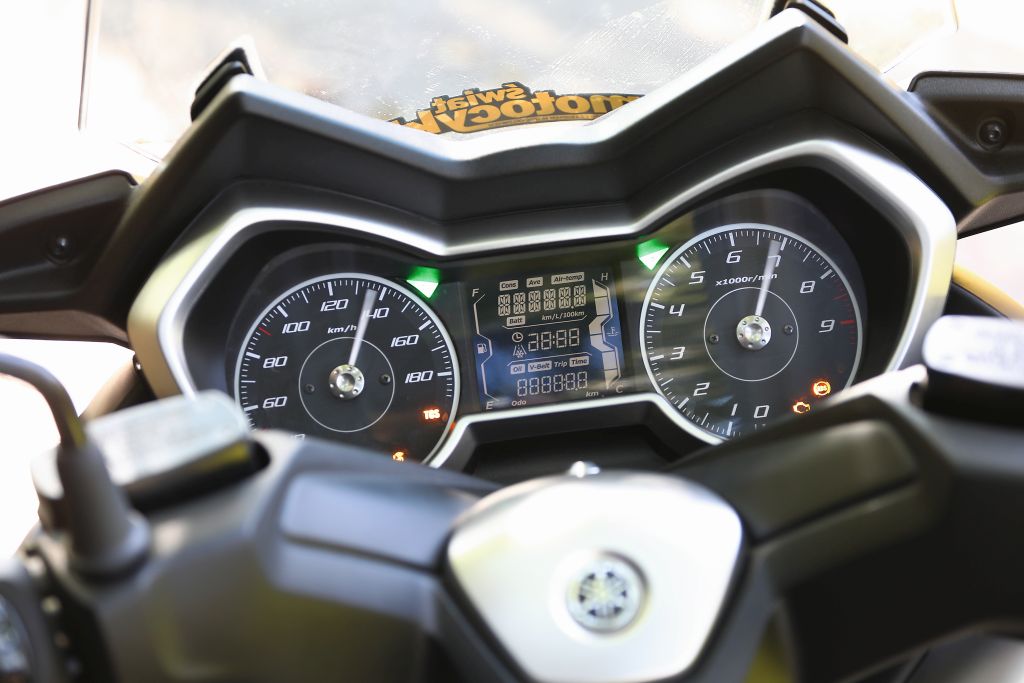 Właściciel skutera ma możliwość częściowego dostosowania wysokości kierownicy i szyby ochronnej do swoich wymagań. Tu pojawia się jednak pewien zgrzyt, gdyż do tych czynności potrzebne są klucze. Kierownicę można ustawić w dwóch położeniach o różnicy 20 mm w pionie, zaś szybę da się regulować w zakresie 50 mm. W centrum dowodzenia mamy analogowy prędkościomierz i obrotomierz oraz zawarty miedzy nimi wyświetlacz. Przyrządy są wzorem czytelności.