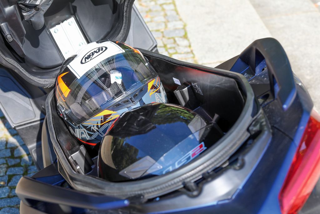 Aby otworzyć kanapę, lewy schowek na panelu oraz wlew paliwa wystarczy nacisnąć stosowny przycisk elektryczny. Prawy schowek nie jest niczym zabezpieczony, dzięki czemu można z niego skorzystać podczas jazdy, np. gdy chcemy wyjąć okulary przeciwsłoneczne. Pokrycie przekroku jest wykonane z matowego tworzywa o fakturze przypominającej ekologiczną skórę. Dzięki temu, że jest matowe, nie pozostają na nim ślady butów, zasiadającego za kierownicą skuterzysty. W skuterach, w których na przekroku mamy błyszczący plastik, zawsze znajdziemy otarcia i ślady od obuwia. Tego po prostu nie da się uniknąć.