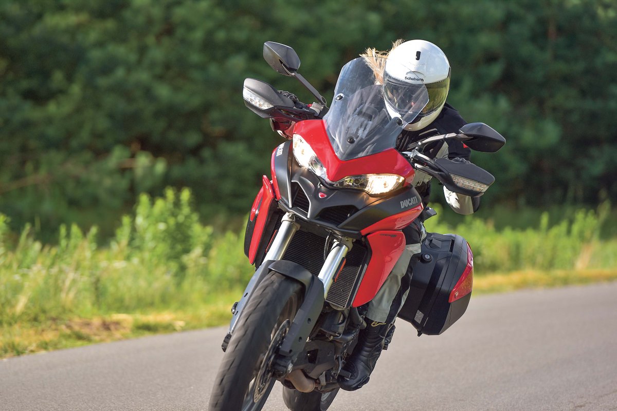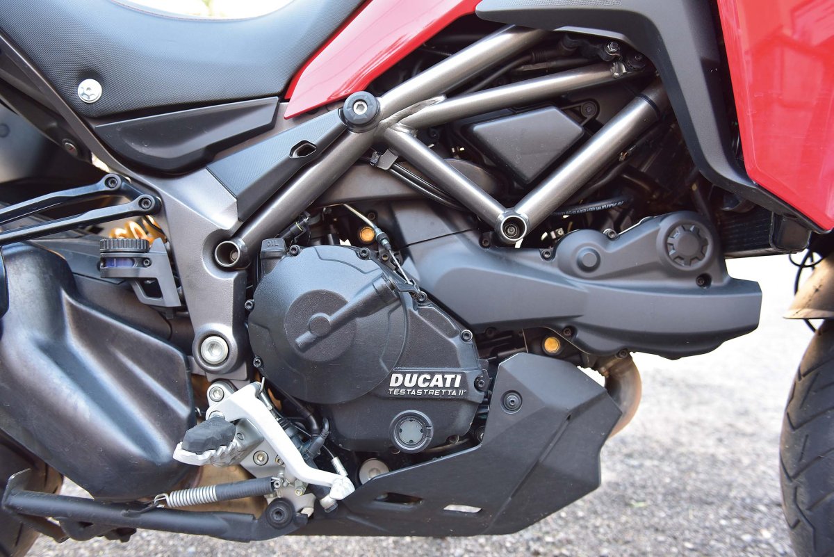 Silnik Testastretta, dwa cylindry ułożone w tradycyjne dla Ducati „L”, 113 koni, 96 niutonometrów, zbiornik – 20 l, cztery tryby jazdy (Sport, Touring, Urban, Enduro), Pakiet Bezpieczeństwa Ducati (ABS + kontrola trakcji DTC Boscha), interwały przeglądowe co 15 000 km lub 12 miesięcy a rozrządu co 30 000 km. Mało? Prędkość maksymalna z bocznymi kuframi – 228 km/h.
