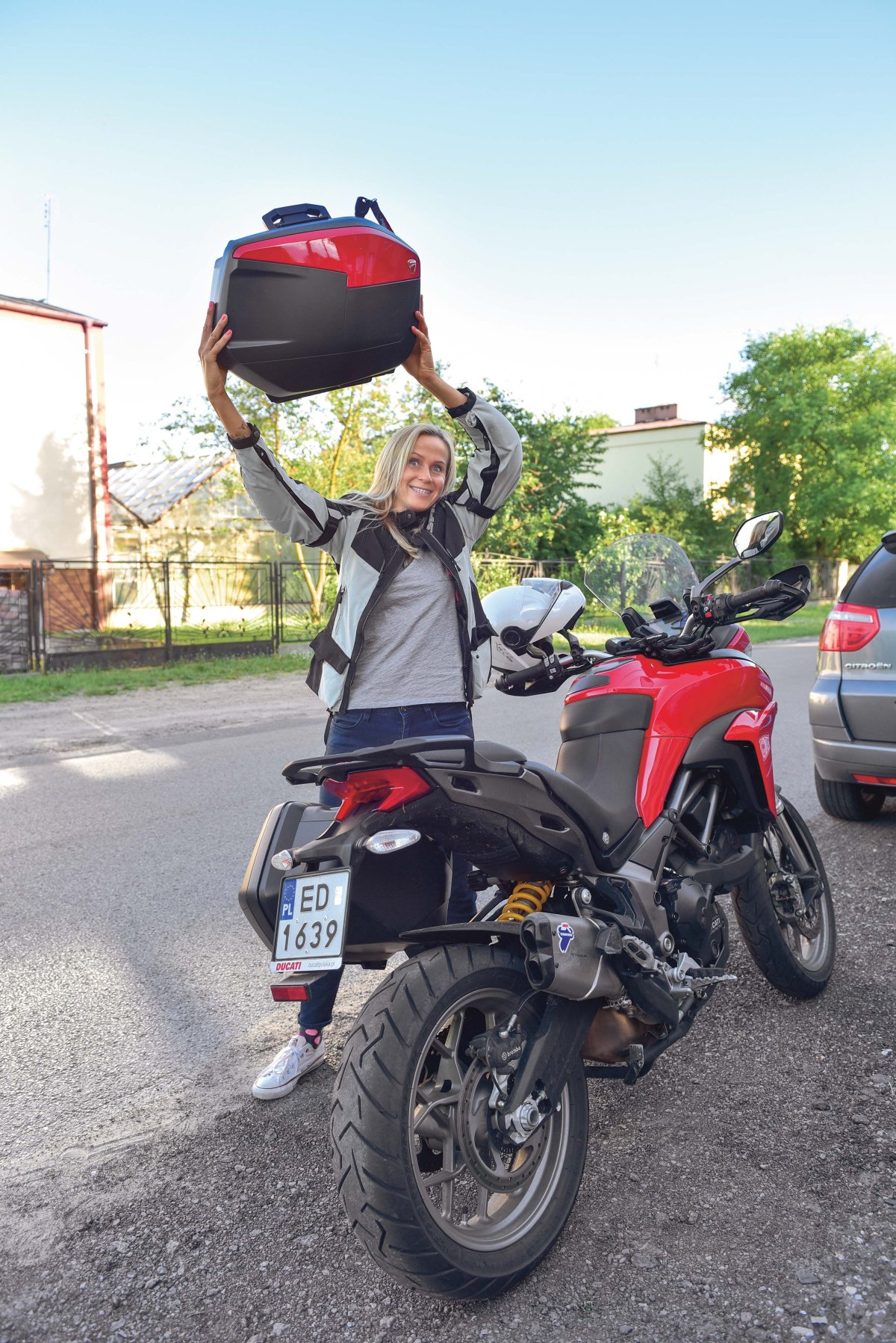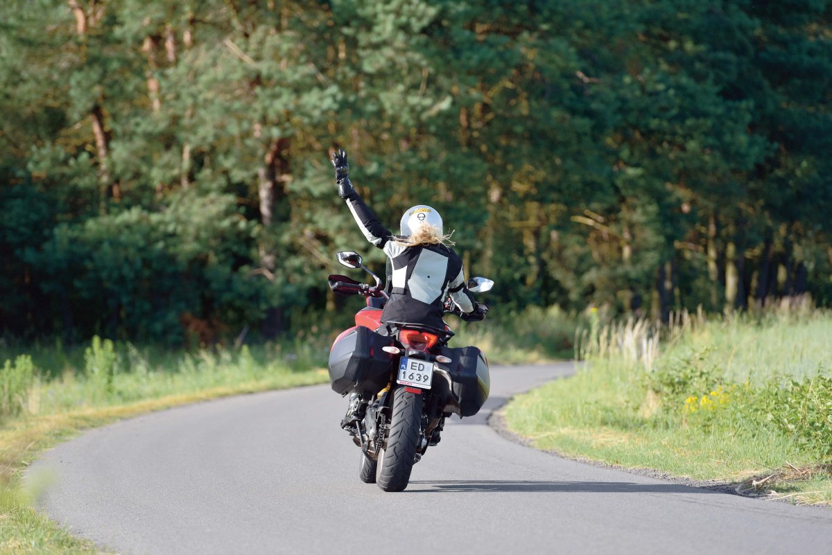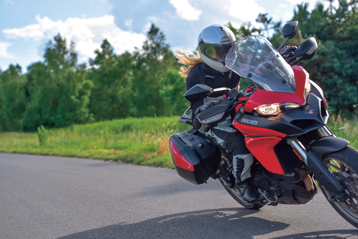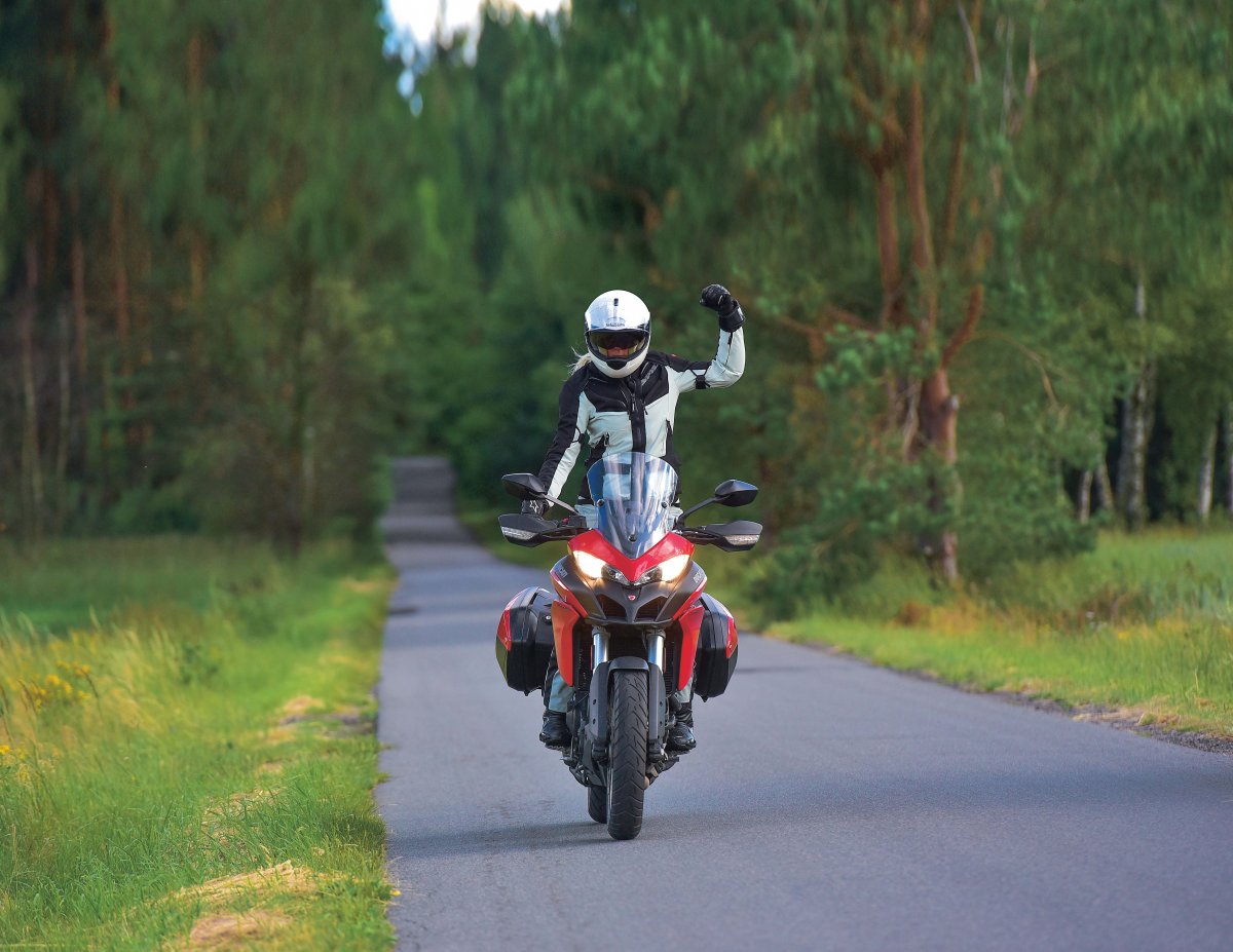 Jestem bardzo zadowolona z babskiego wyjazdu Ducati vs Karolajna. Multistradą 950 zrobiłam 1125 km. Średnie spalanie – 6,1 l/100 km przy średniej prędkości około 90 km/h. Powód do radości jest taki, że to sprzęt megadynamiczny, latający po zakrętach, bardzo wygodny. Z moją skoliozą i płaskostopiem po przejechaniu połowy dystansu nie odnotowałam absolutnie żadnego zmęczenia. Lusterka do prędkości 150 km/h są bezpieczne, duże, szyba na najniższym ustawieniu wywala strugi powietrza w kosmos, ergonomiczne przełączniki powodują, że nic przez przypadek się nie włącza. Wyświetlacz z komputerem podaje najważniejsze informacje, które łatwo przełączysz lewym palcem i wiesz, ile jest stopni, ile paliwa zostało, jakie jest spalenie, temperatura silnika, który bieg aktualnie wpadł oraz w którym trybie z czterech możliwych jedziesz, no i jak ustawione są DTC oraz ABS.