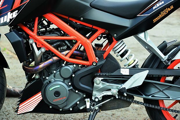 Dla silnika Duke’a 390 charakterystyczne jest delikatne oddawanie mocy w szerokim zakresie obrotów. Ktoś może to odebrać jako wadę, jednak jeśli weźmiemy pod uwagę, że KTM spełnia normy motocykla przeznaczonego dla świeżo upieczonych, młodych i przede wszystkim niedoświadczonych kierowców, ta cecha stanie się zaletą. Lecz z pewnością nie każdemu ta delikatność przypadnie do gustu.