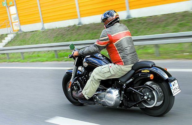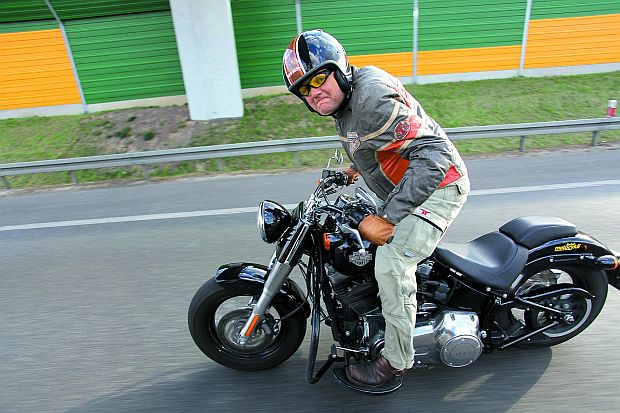 Nogi wcale nie są wywalone do przodu, a ręce rozłożone w miarę szeroko. W dodatku motocykl w czasie jazdy wydaje się znacznie mniejszy, niż gdy patrzymy na niego z boku. Można się do tego przyzwyczaić, ale długodystansowa jazda turystyczna Harleyem-Davidsonem FLS Softail Slim z pewnością nie należy do najbardziej komfortowych. Tak, jak w latach 50.