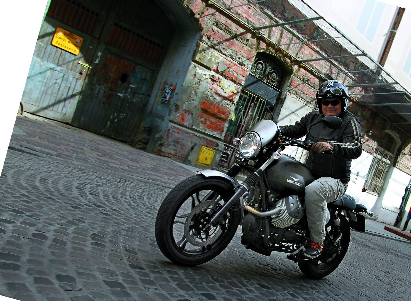 W ręce wpadł nam ostatni jej wytwór – V7 Stone w kolorze Nero Ruvido, w dodatku nieźle dopasiony akcesoriami. Niech jednak nie zwiedzie Was wygląd maszyny. Nie jest to nowe Storonello, czyli fabryczny scrambler made by Guzzi. To po prostu V7 Stone II, nieco upiększone przez właściciela. Można powiedzieć, że fabryka po prostu wzorowała się na prywatnym właścicielu, bo rzeczony motocykl ujeżdżaliśmy, zanim jeszcze na targach w Mediolanie oficjalnie zaprezentowany został Storonello. Ciekawostką jest fakt, że właśnie w tym roku, czyli niemal 50 lat od premiery, Guzzi powraca do korzeni, bo model z roku 1967 miał dokładnie taką sama nazwę. Cóż – skoro mogło Ducati, może i MotoGuzzi. Nie ma przecież nic złego w czerpaniu z własnych tradycji.