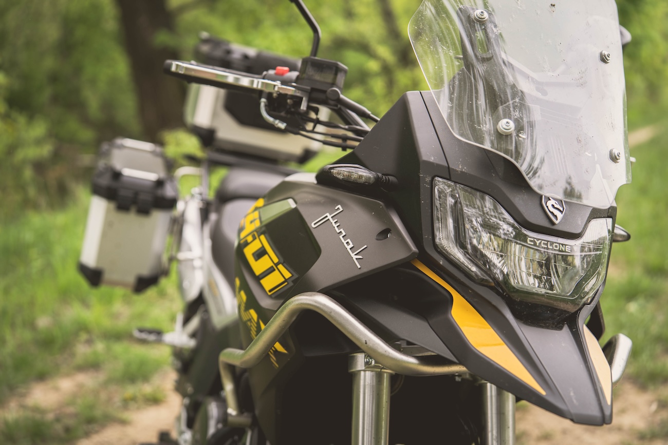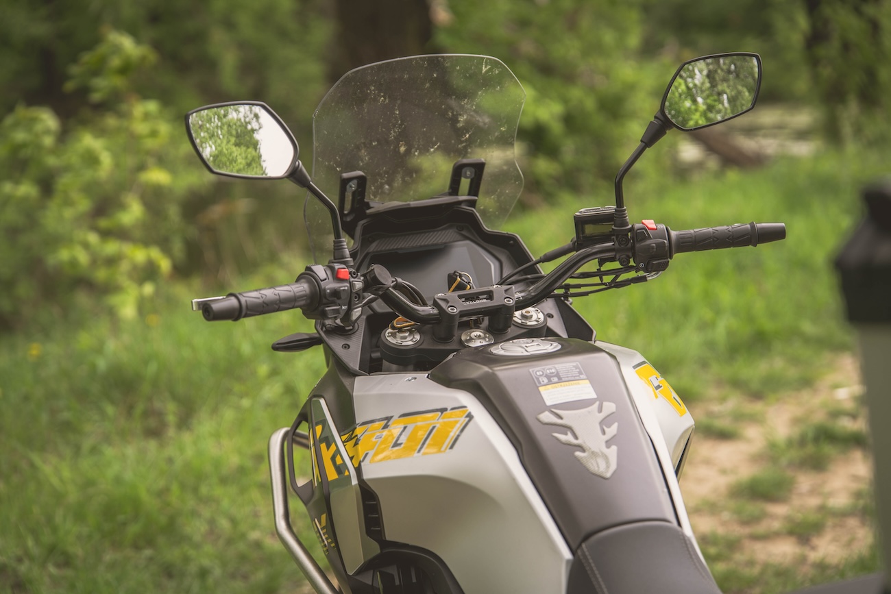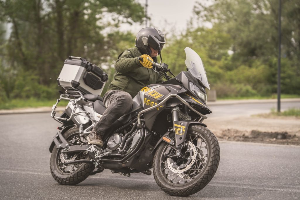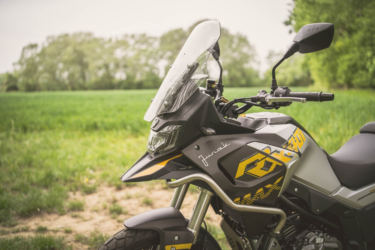 Przez niemal pół roku, dzięki uprzejmości importera, firmie Almot, miałem okazję ujeżdżać ich testowy egzemplarz i przekonałem się o jego niezawodności. Junaczek nie miał lekkiego życia, bo przede mną dosyć intensywnie eksploatował go Tobiasz Kukieła, znany z bezkompromisowego stylu jazdy. I nie udało mu się go popsuć, co świadczy o wybitnej odporności konstrukcji. Motocykl wyposażony jest we wszystko to, co potrzebne jest mi do szczęścia, a w dodatku nie ma przekombinowanej elektroniki. Chociaż z drugiej strony, trochę brakuje mi na wyświetlaczu informacji o chwilowym spalaniu i zasięgu, co przydaje się w podróży. Gmole, centralny podnóżek, płyta pod silnikiem, regulowane klamki, a przede wszystkim fantastyczny zestaw aluminiowych kufrów… Czego więcej chcieć? W dodatku siedzisko umieszczone jest dosyć nisko, na wysokości 810 cm, co przy moim mizernym wzroście ma znaczenie. Dodatkowe gadżety, jak handbary, światła przeciwmgielne czy podgrzewane manetki – dokupię. Oczywiście na chińskich aukcjach, żeby Junak nie miał kompleksów. Ale nawet bez tych upiększaczy motocykl prezentuje się nowocześnie i elegancko. Chyba najbardziej podobają mi się w nim koła – z klasycznymi szprychami i nietypowym rozwiązaniem aluminiowych felg, z nadlewami pod każdą szprychę osobno, żeby dobrze działała bezdętkowość.