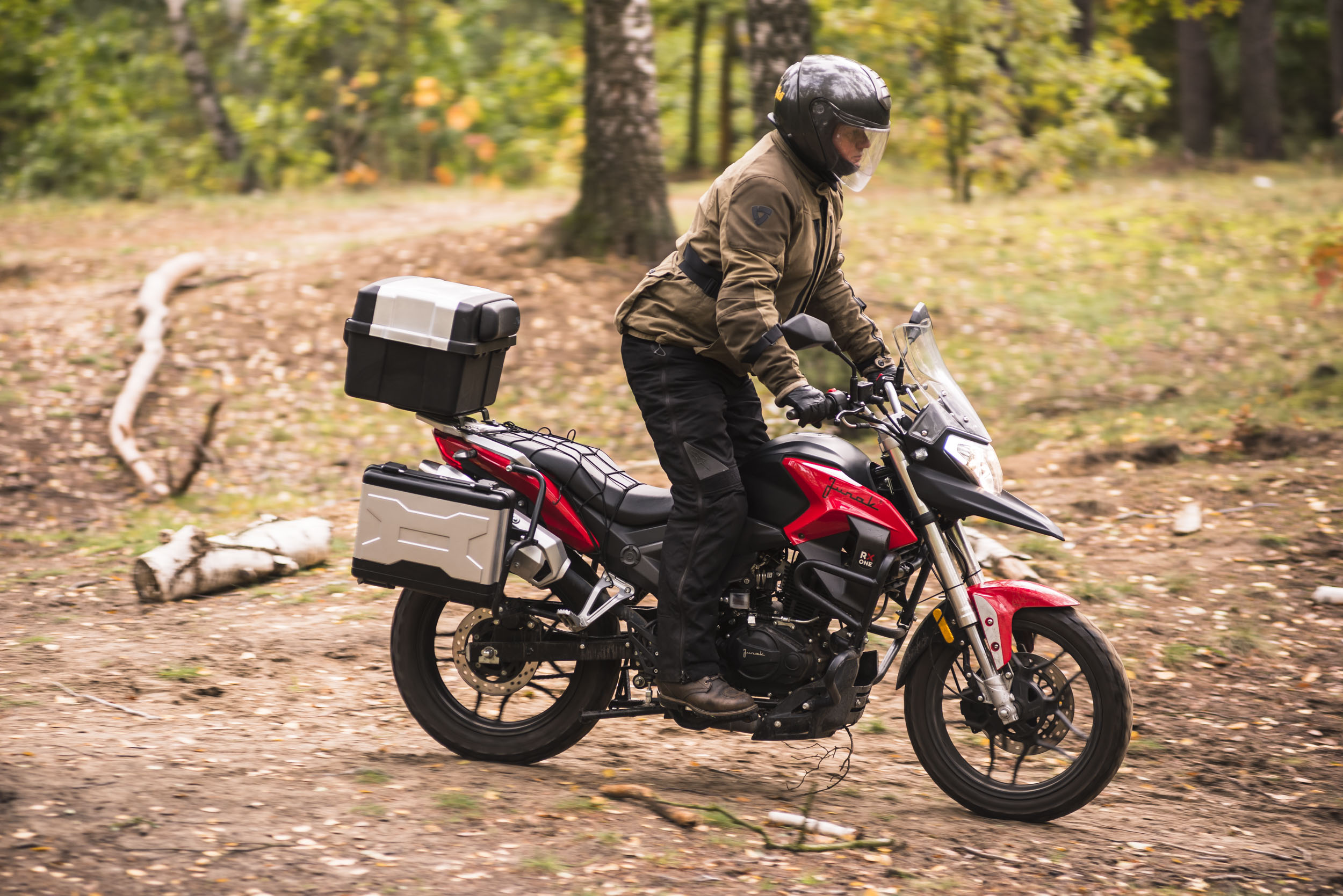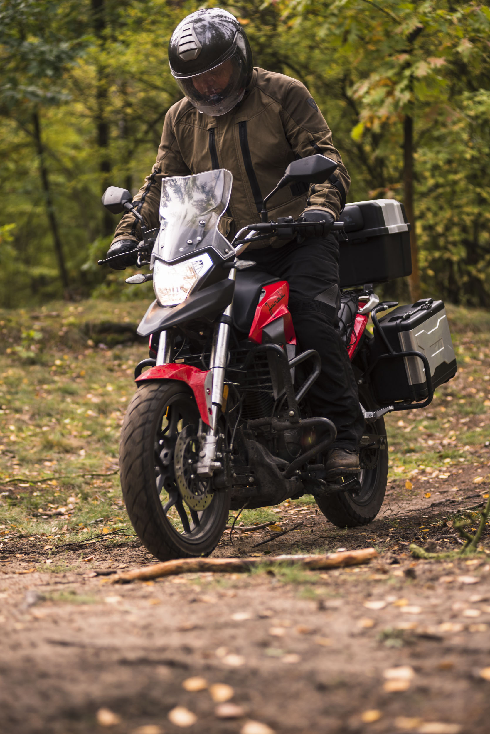 Na Mazurach motocyklem bądź co bądź typu Adventure nie mogłem sobie odmówić próby jazdy terenowej. Po ubitych, leśnych szutrach szło całkiem nieźle (nie licząc braku możliwości hamowania samym tylnym kołem!) jednak na piaskach było dramatycznie źle. Opony nie takie, przełożenie zbyt szosowe no i ten brak mocy. Na szczęście Junaczek jest tak solidnie „ogmolowany” (w pełnym rynsztunku waży ok 165 kg), że nawet starszy pan może się nim bez większych obaw w piachu wywracać. To ogromna zaleta małego „adwenczura”.