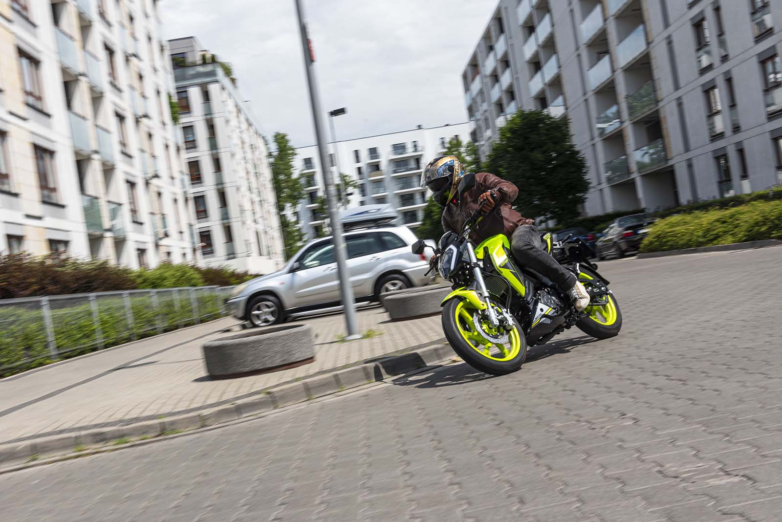 W tym przypadku jeździec ma do dyspozycji aż sześć biegów, a że motorek lubi się kręcić „wysoko”, to trzeba nimi nieco powachlować aby jazda była rzeczywiście dynamiczna. Ta częsta zmiana biegów przynosi jednak bardzo dobre rezultaty. Gdy cały czas utrzymujemy silnik na obrotach zbliżonych do maksymalnych, w mieście będziemy bardzo szybcy. Pode mną prędkościomierz maksymalnie wskazywał 121 km/h i gdyby nie fakt, że ECU odcinał już zapłon, pewnie udałoby się wydusić jeszcze więcej.