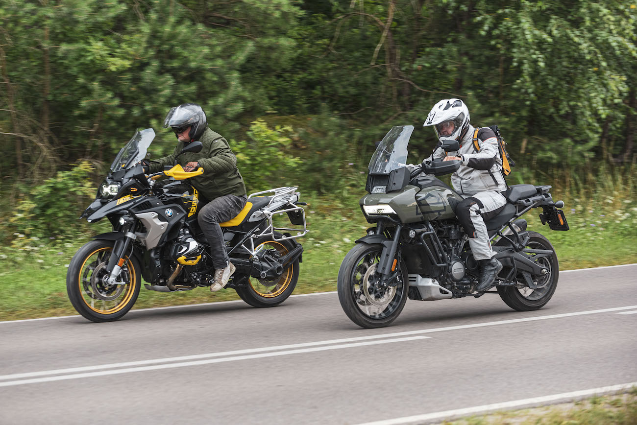 Dosyć jednak ględzenia – czas usiąść za sterami i ruszyć w drogę. W moim przypadku trasa testowa jest zawsze taka sama: Warszawa-Mrągowo i z powrotem, większość asfaltami, troszkę szutrami, unikam piasków i błot. Dystans to mniej więcej 500 km, czyli wystarczająco, aby porównać właściwości obu maszyn. Jedziemy we dwóch i zamieniamy się motocyklami co jakiś czas. Takie przesiadki to najlepszy sposób na wyrobienie sobie opinii. Na początku siadam za sterami Harleya. Na kierownicy naliczyłem aż 26 różnych przycisków. Nie od razu, ale zaczynam się w nich orientować i nawet zaczynam się nimi bawić.