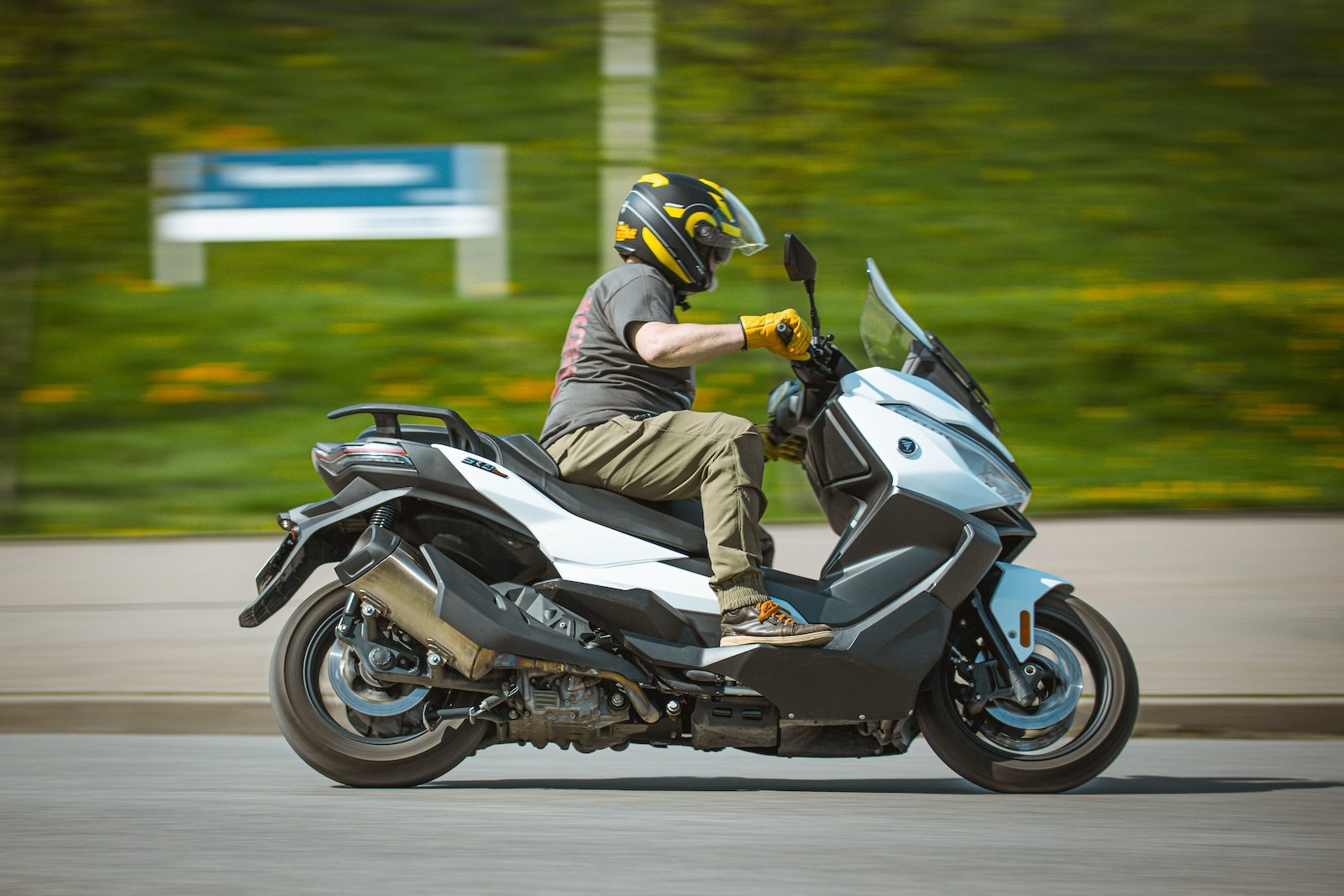 Skuter na szczęście nie jest przesadnie wyposażony w guzikologię, więc jego obsługa jest intuicyjna, ale jak później się okazało, nie do końca. Dla tradycjonalistów do samej jazdy wystarczy rollgaz i dźwignie hamulców. Jeżeli ktoś jest dodatkowo zainteresowany podawanymi na sporym (siedmiocalowym) kolorowym wyświetlaczu TFT dodatkowymi parametrami, to przy lewej manetce ma dwa przyciski, którymi można się nieco pobawić. W funkcjach wyświetlacza zabrakło mi zasięgu i chwilowego zużycia paliwa – moich ulubionych parametrów. Albo producent uznał, że nie są konieczne, albo ja nie umiałem się do nich dobrać. Nie ma jednak zmartwienia – akurat Voge to producent dosyć szybko reagujący na sygnały z rynku, więc spodziewam się, że albo dołoży te funkcje (importer twierdzi, że są), albo uczyni menu bardziej intuicyjnym. Na pocieszenie mamy za to bezkluczykowy system uruchamiania, wyświetlane ciśnie w obu oponach oraz z przodu kamerę rejestratora 108OP, wymagającą jednak zainstalowania dodatkowej karty pamięci i specjalnej aplikacji w telefonie. Trochę to skomplikowane, ale do przeżycia. Z wyposażeniem skutera zasadniczo też nie jest źle – na pokładzie znajdziemy zawieszenie KYB, hamulce JJuan, dwukanałowy system ABS Continental oraz seryjnie montowane opony Pirelli. Z przewozem bagażu nie będzie problemu – schowek pod siedzeniem oferuje 41 l pojemności, co przekłada się na możliwość upchnięcia jednego pełnowymiarowego kasku i dodatkowo sporej ilości gratów. Dodatkowo w przedniej osłonie zainstalowano dwa niewielkie schowki (z elektromagnetycznymi zamkami) z gniazdem USB do szybkiego ładowania. Przednia szyba ma możliwość regulacji, pod warunkiem, że mamy przy sobie klucz ampulowy 5 mm, którym odkręcimy śruby i przesuniemy szybę wyżej lub niżej.