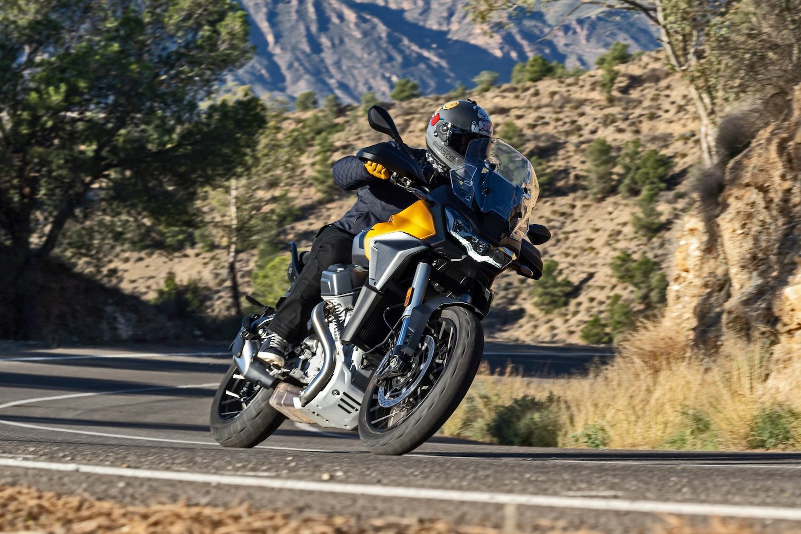 Wzdłużny V-twin o pojemności 1042 cm³ generuje 115 KM przy 8700 obr./min i maksymalny moment obrotowy 105 Nm przy 6750 obr./min. Do 160 KM w KTM-ie, czy 145 KM w GS-ie to daleko, ale już z Tigerem 900 czy Africą Twin może stawać w szranki, bez jakiejkolwiek zadyszki. W trakcie pokonywania asfaltowych tras wokół hiszpańskiej Almerii, łapaliśmy wysoce autostradowe prędkości i stwierdzam, że Stelvio jest stworzone do długich podróży. Pozycja za kierownicą jest doskonała (względem V100 kierownicę podniesiono o 100 mm), stopy wygodnie opierają się o podnóżki, a przy tym są na tyle wysoko, by nie iskrzyć o asfalt przy głębokich złożeniach. 246 kilogramów gotowego do jazdy adwenczera, to według teoretyków wartość nie do zaakceptowania. Być może. W szybkich długich winklach motocykl jest pewny i stabilny, prowadzi się wręcz intuicyjnie. Łatwo wyczuć, gdzie jest granica przyczepności, nawet gdy tempo grupie narzuca były zawodnik mistrzostw Włoch.