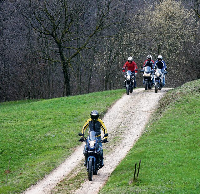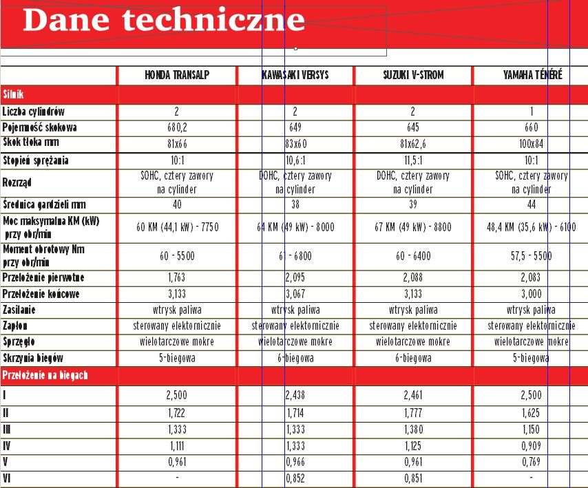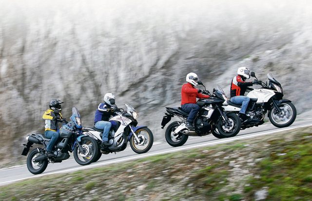 Najbardziej obszerny, w rozumieniu gabarytów, jest Suzuki V-Strom. Najsmuklejsza, ale niestety także najwyższa, jest z kolei Yamaha XTZ 660 Ténéré. Kawasaki Versys szczyci się lekkością formy, zaś Transalp, choć jest nieco cięższy od pozostałych, daje się łatwo opanować. W ruchu wszystkie cztery wykazują dużą zwinność i łatwość w prowadzeniu, ale prawdziwym zaskoczeniem jest V-Strom, którego doskonała równowaga, połączona ze znakomitym dwucylindrowym silnikiem czynią „ważką”. Także Versys sprawia wrażenie niewiarygodnej lekkości, jego podwozie sprawdza się w każdej sytuacji i aż się prosi o dodanie gazu. Siedząc w jego siodle, wszystko staje się proste, nie ma nadmiernie agresywnego wyglądu, ale najbardziej sportową duszę.