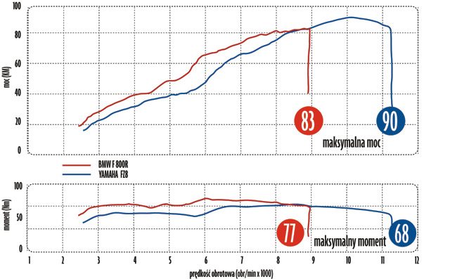 Na jej szczęście jest niesamowicie elastyczny. Na jednym biegu bez dotykania dźwigni biegów można przejechać naprawdę spory odcinek trasy. Zdaje się być to niewykonalne na BMW, gdzie trzeba mocno napracować się biegami, aby utrzymać odpowiednie tempo. Także na każde przymknięcie i otwarcie przepustnicy F 800R reaguje bardziej nerwowo niż FZ8. Do tego Yamaha niezwykle chętnie wkracza w wysokie rejestry obrotów, a tam jej moc już imponuje. Zupełnie odwrotnie do BMW. F 800R wydaje się stronić od wysokich obrotów, a jazdę z prędkością pomiędzy 120 a 130 km/h można uznać wręcz za nieprzyjemną. Motocykl wpada wówczas w dość nieprzyjemny rezonans, a wibracje przenoszone na całą konstrukcję zdają się osiągać swoje apogeum na rączkach kierownicy.