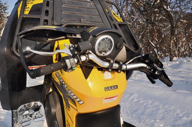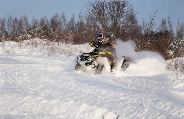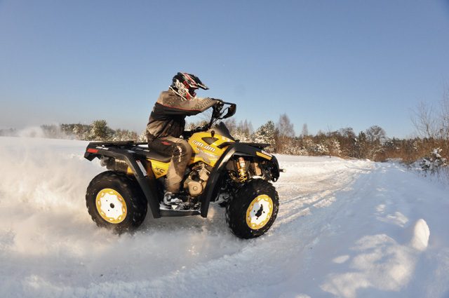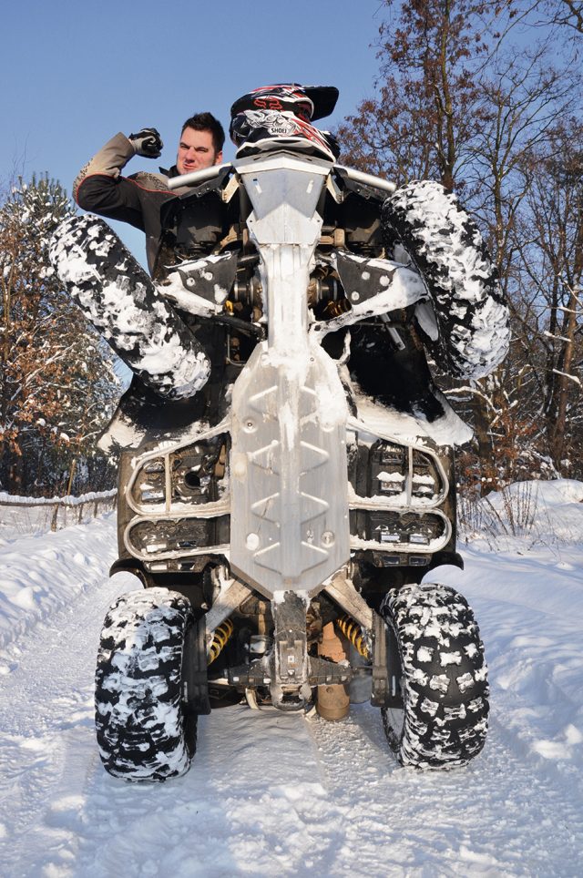Gdy dosiądziemy sportowego Can-Ama, warto zwrócić uwagę na układ hamulcowy sterowany za pośrednictwem oddzielnych klamek i dźwigni nożnej. Drobiazgi można schować do dwóch schowków umieszczonych w przednim i tylnym bagażniku. Musimy jednak pamiętać, że schowki te nie są hermetyczne. To, co trzeba postawić na piedestale, to wspomaganie kierownicy. Staje się ono standardem wśród ATV najwyższej klasy. Tu mamy do dyspozycji układ działający w dwóch trybach twardości. Na takie pojazdy jest przyjemnie popatrzeć, ale jeszcze lepiej się nimi jeździ. Z rozruchem nie ma problemu, po chwili powietrze dudni od odgłosu V-Twina. Z lekkim oporem wbijam bieg H i quad rusza pełną parą. Sprzęt przyspiesza w błyskawicznym tempie. Wspomaganie doskonale pracuje, w sytuacji kiedy nawracamy w kopnym śniegu, a pojazd mieli breję, kierowca nie odczuwa, ile ton ginie pod kołami. Jak ciężka to praca, wiedzą tylko ci, którzy jeździli ciężkimi quadami bez wspomagania w podobnym terenie. Jak pchane przodem zwały puchu osiągnęły apokaliptyczne rozmiary i każdy normalny kierowca zasiadłby za sterem pługa wirnikowego, my sięgamy po reduktor.