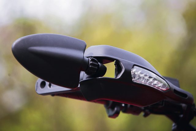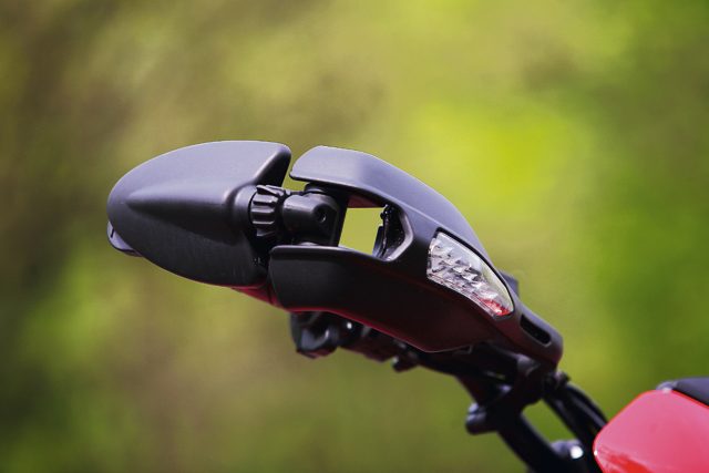 Tablica wskaźników to nic w porównaniu z lusterkami. Nazwanie ich przerostem formy nad treścią jest naprawdę bardzo łagodne. Nie wiem, czym kierował się ich konstruktor, ale na pewno nie zdrowym rozsądkiem. Bo jak inaczej można nazwać rozwiązanie, które jest niepraktyczne i na dodatek źle wykonane? W testowym motocyklu całe osłony rąk, w których umieszczono także kierunkowskazy, ciągle zmieniały swoje położenie, pomimo prób skręcania wszystkich połączeń. Co więcej, szansa na to, że po którymś kolejnym złożeniu i rozłożeniu lusterek wrócą na to samo miejsce jest znikoma.